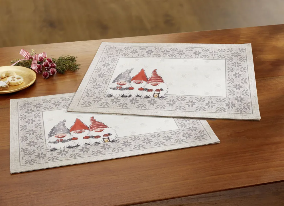 Diese hübsch gestaltete Tisch- und Raumdekoration bringt mit ihren fröhlichen Wichtelmotiven eine festliche und zugleich gemütliche Stimmung in Ihr Zuhause. Kissenbezug mit Reißverschluss. Die Platzsets sind doppelt genäht und liegen dadurch besonders gut auf dem Tisch. Die Qualtität: 100% Polyester. Waschbar bis 30 °C.