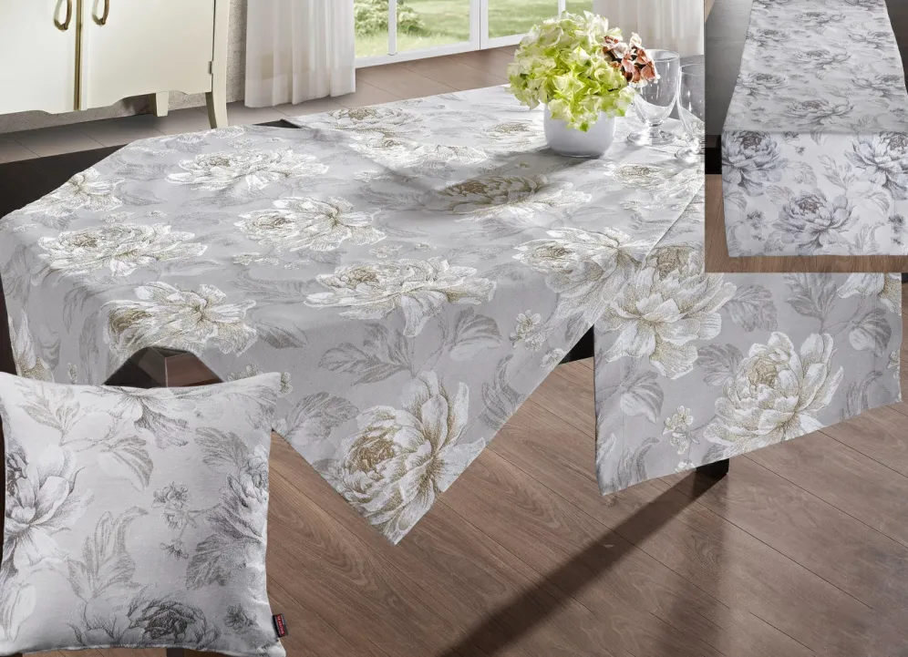 Tischdecke oder Kissenbezug mit Blüten-Dessin in Größe 404 (Kissenbezug, 40x 40 cm) und in Beige-Silber.