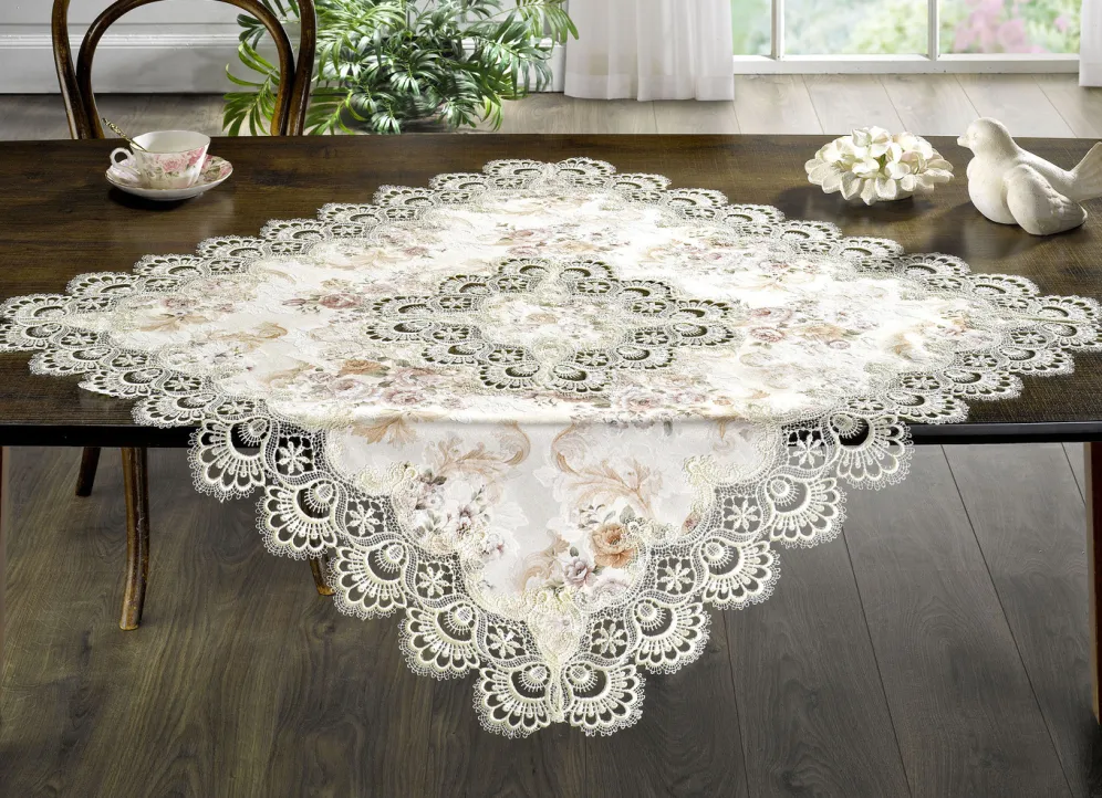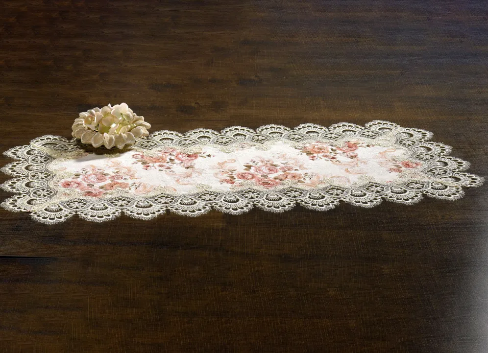Setzen Sie Akzente mit dieser besonders edlen Tisch- und Raumdekoration. Aus Jacquard mit feinster Macramé-Spitze. Qualität: 100% Polyester. Waschbar bis 40 °C