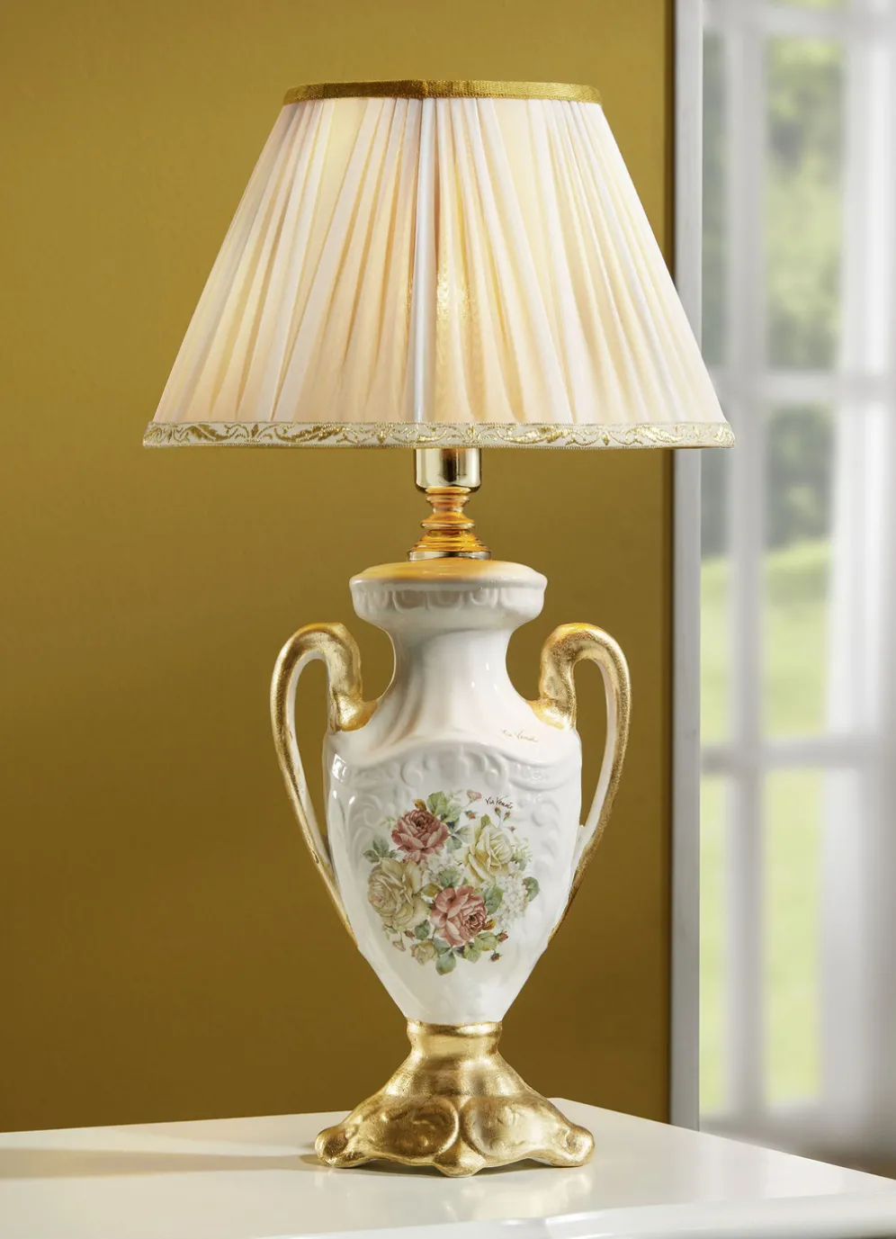 Sichern Sie sich einen royalen Blickfang für Ihr Wohnzimmer: diese exquisite, italienische Tischleuchte wird Sie begeistern! Mit von Hand aufgetragenem Blattgold und handgemaltem Blumendekor am edel verzierten Lampenfuß aus Keramik! Das faszinierende Erscheinungsbild wird komplettiert durch den textilen Lampenschirm (100% Baumwolle) mit tollen Goldrändern. Fassung: 1x E14, max. 60 Watt, 230 Volt. Die Lieferung erfolgt ohne Leuchtmittel. Maße: Höhe 50 cm, Lampenschirm ø 25 cm