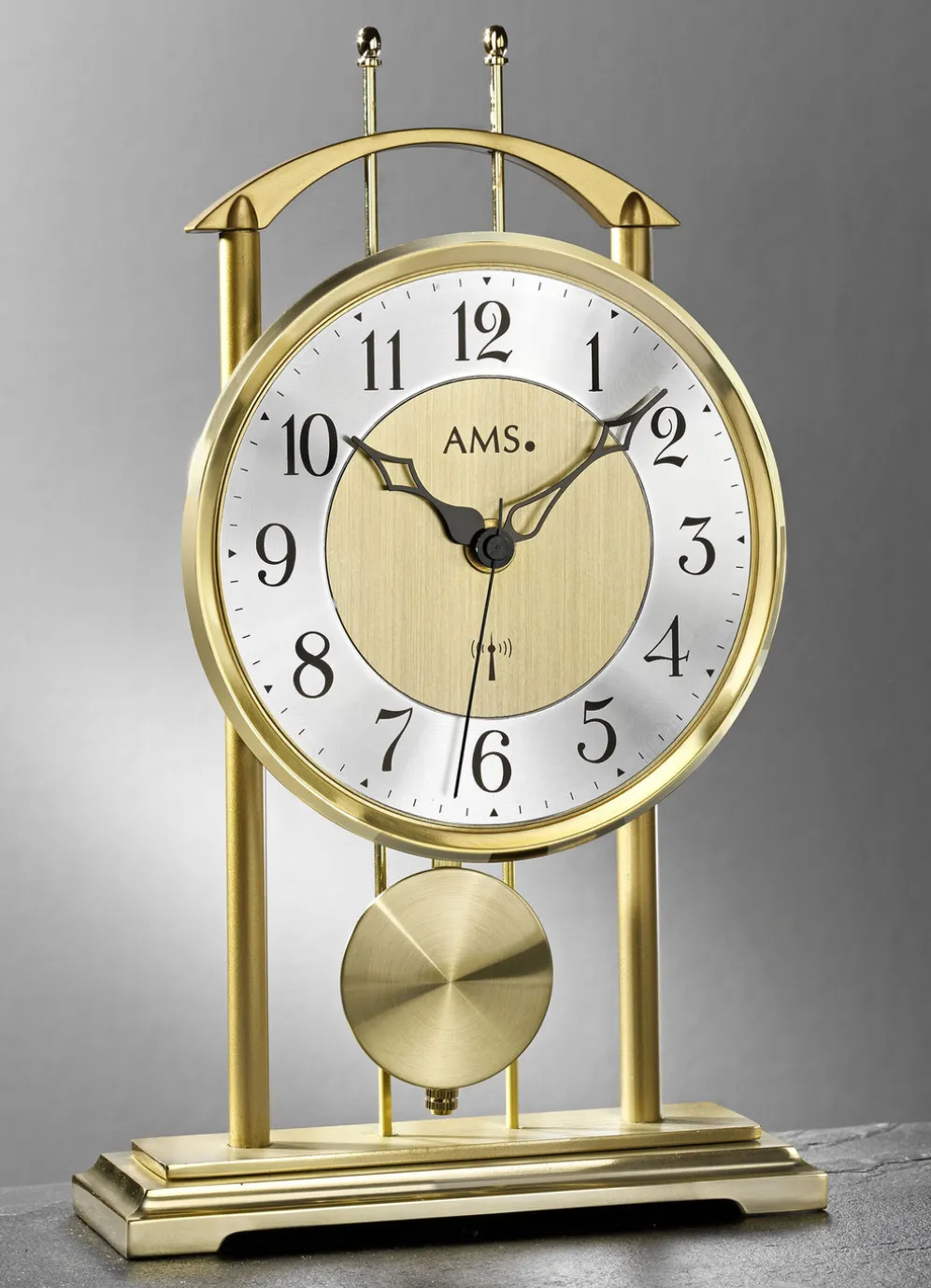Ein tolles Dekorationsobjekt ist diese hochwertig gearbeitete Tischuhr. Mit rundem Metallziffernblatt, arabischen Zahlen und Antikzeigern. Die Stäbe, Pendel sowie Sockel sind aus Metall und runden das edle Erscheinungsbild ab. Mit Funkwerk, batteriebetrieben mit 2x 1,5 Volt Mignon (nicht im Lieferumfang enthalten). Maße: B17,5xH29xT7 cm.