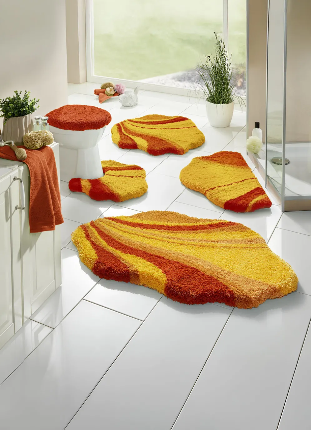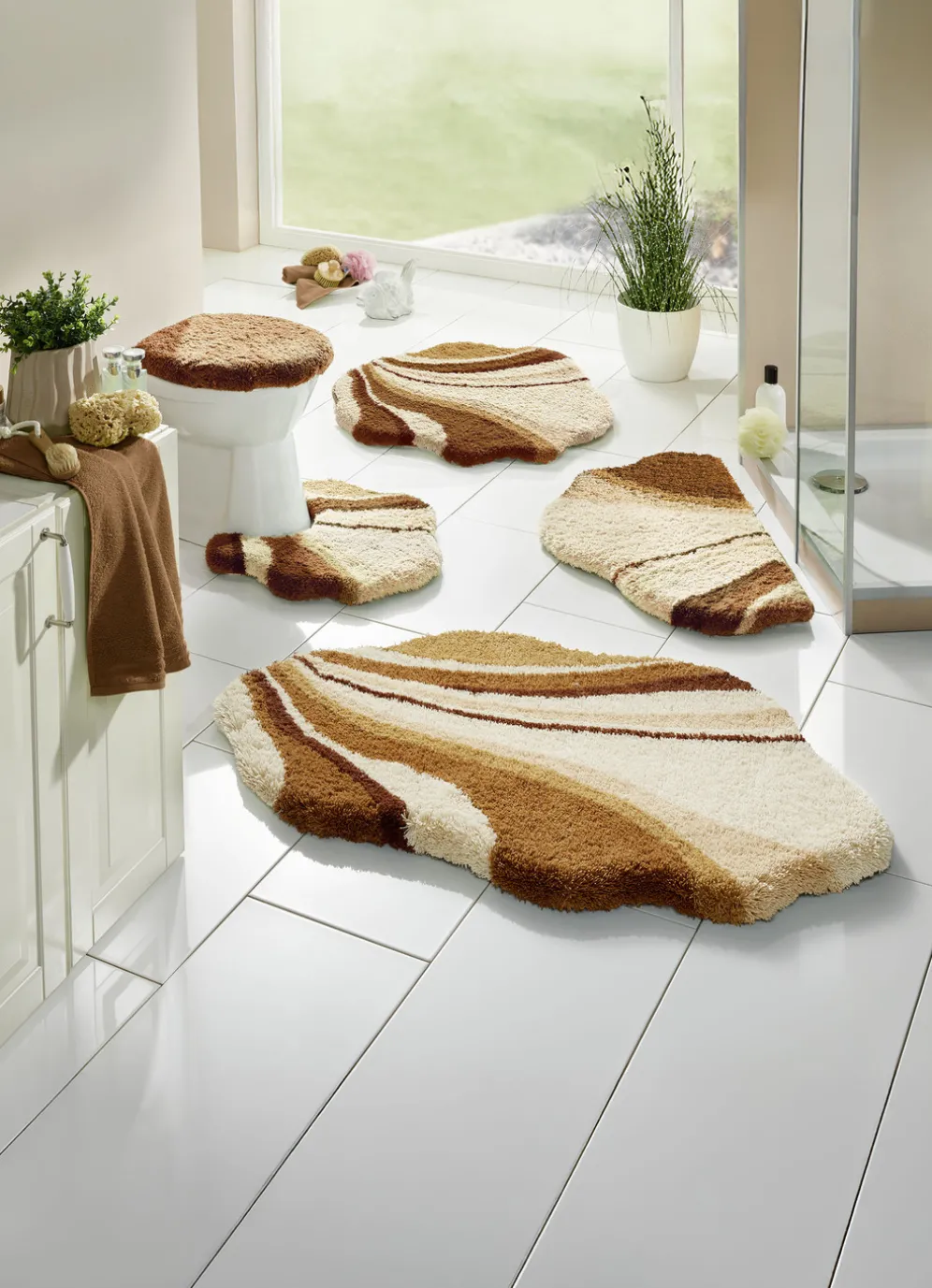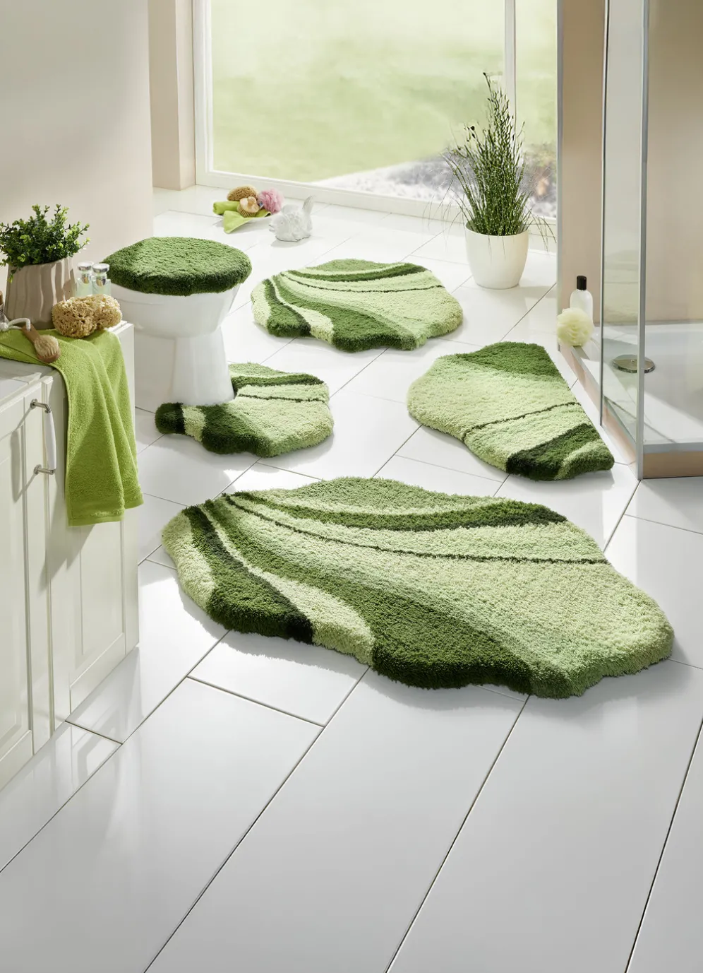 | Size | 100 (Vorleger halbrund, 50/ 80 cm), 101 (Teppich, 50/ 80 cm), 102 (Teppich, 60/100 cm), 104 (Teppich, 70/120 cm), 106 (Teppich rund, ø 80 cm), 108 (Stand-WC-Vorleger, 50/ 50 cm), 109 (Hänge-WC-Vorleger, 50/ 50 cm), 112 (WC-Deckelbezug, 47/ 50 cm) |