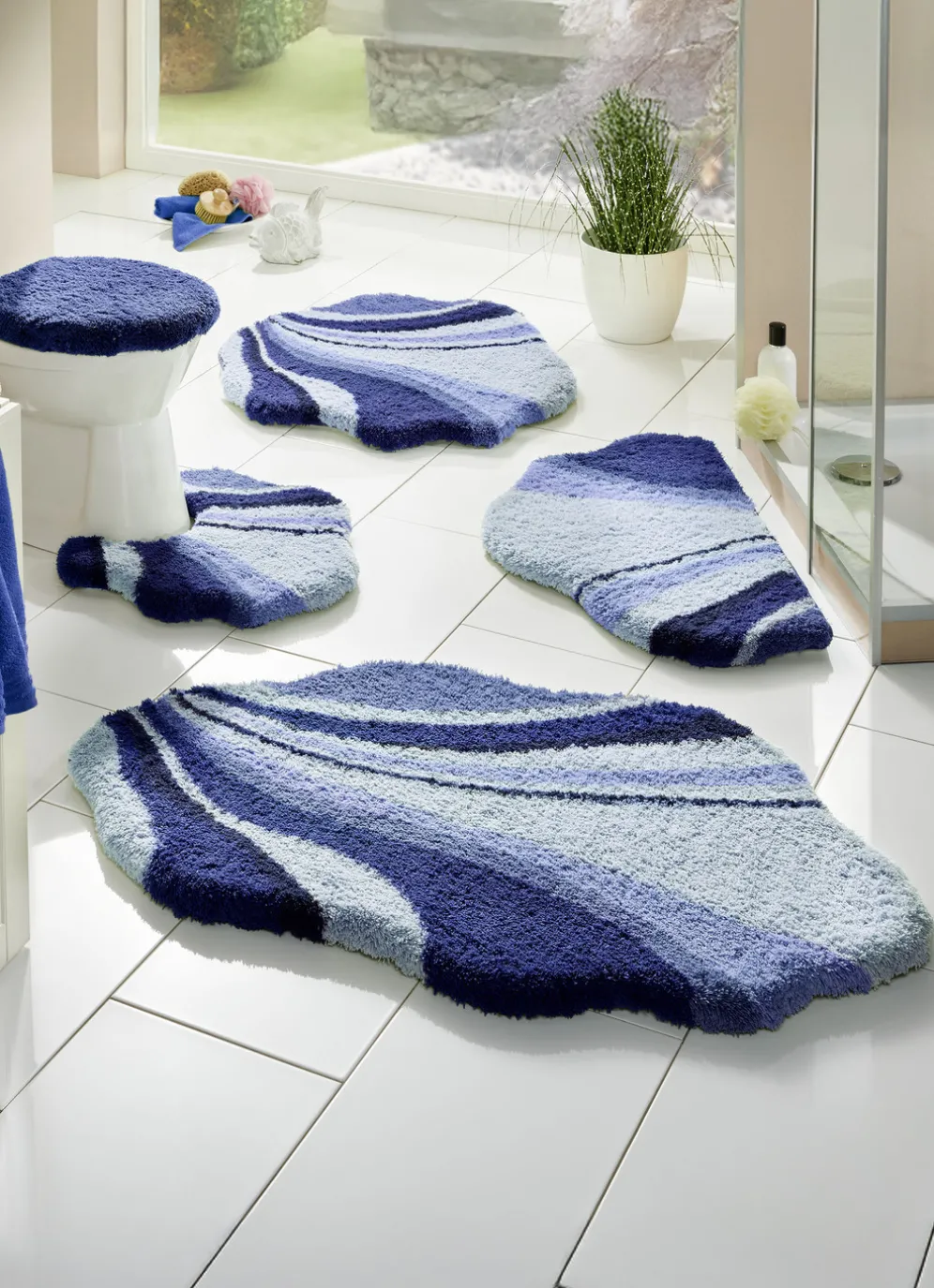 Tolle Badgarnitur in barfußweicher Qualität in Größe 109 (Hänge-WC-Vorleger, 50/ 50 cm) und in Blau.