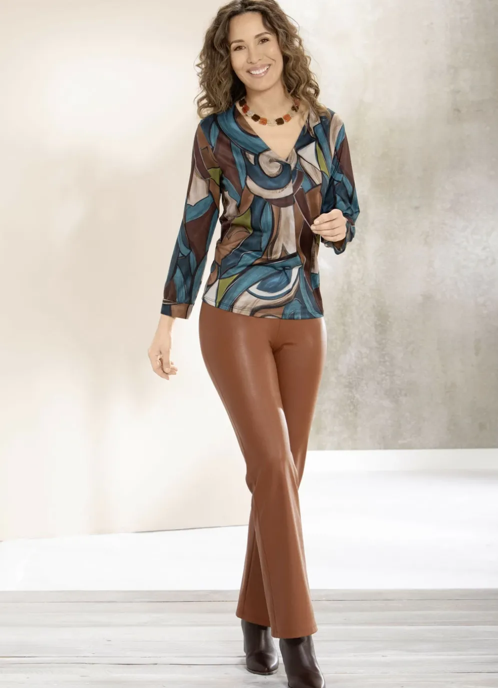 Tolle, petrol-braun-sand-bunte Shirt-Tunika mit V-Ausschnitt, langen Ärmeln mit Bündchen, Kellerfalte im Vorderteil.