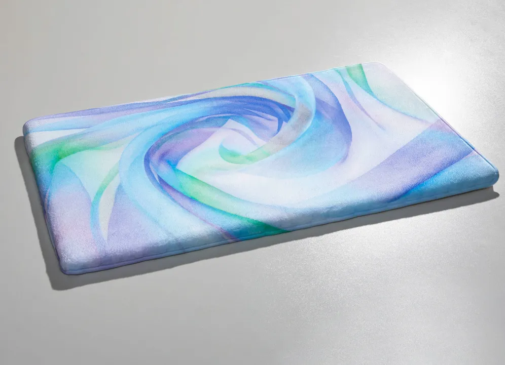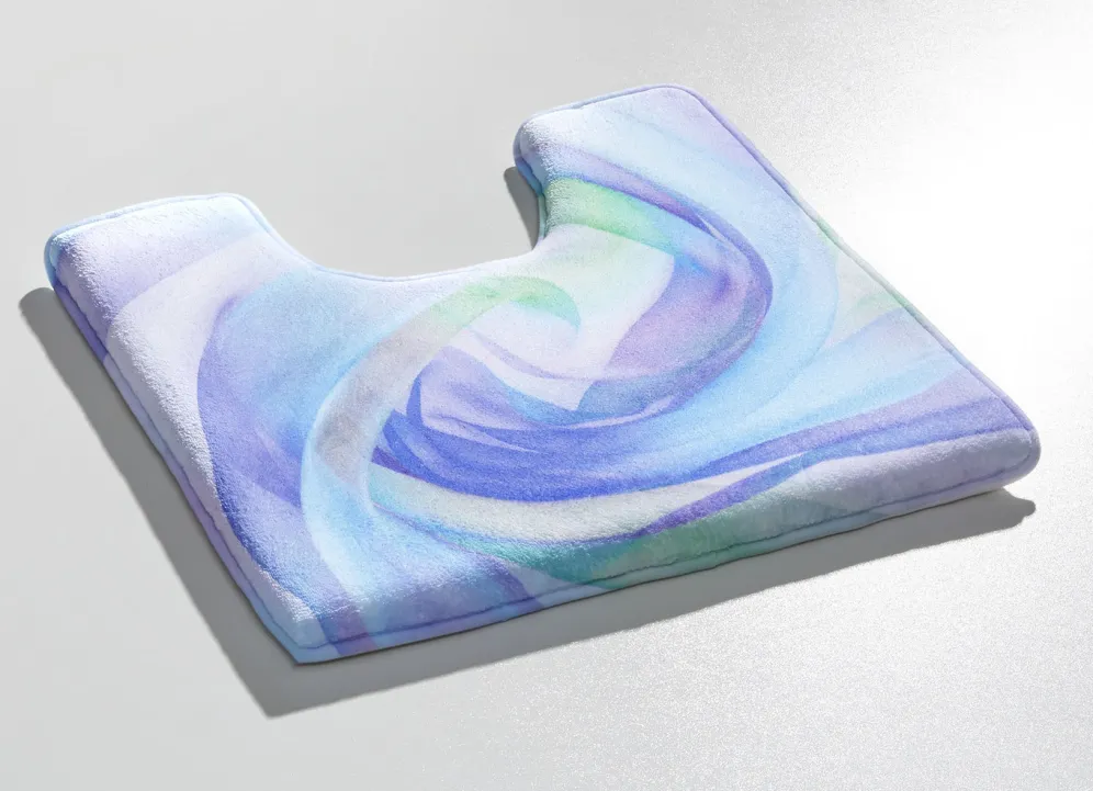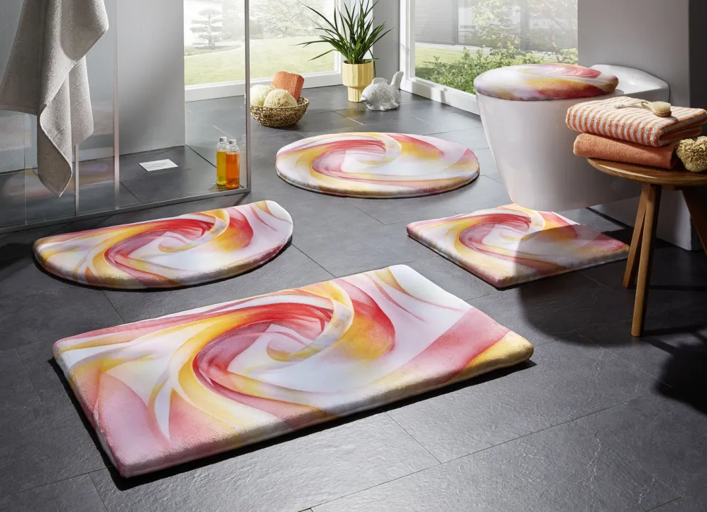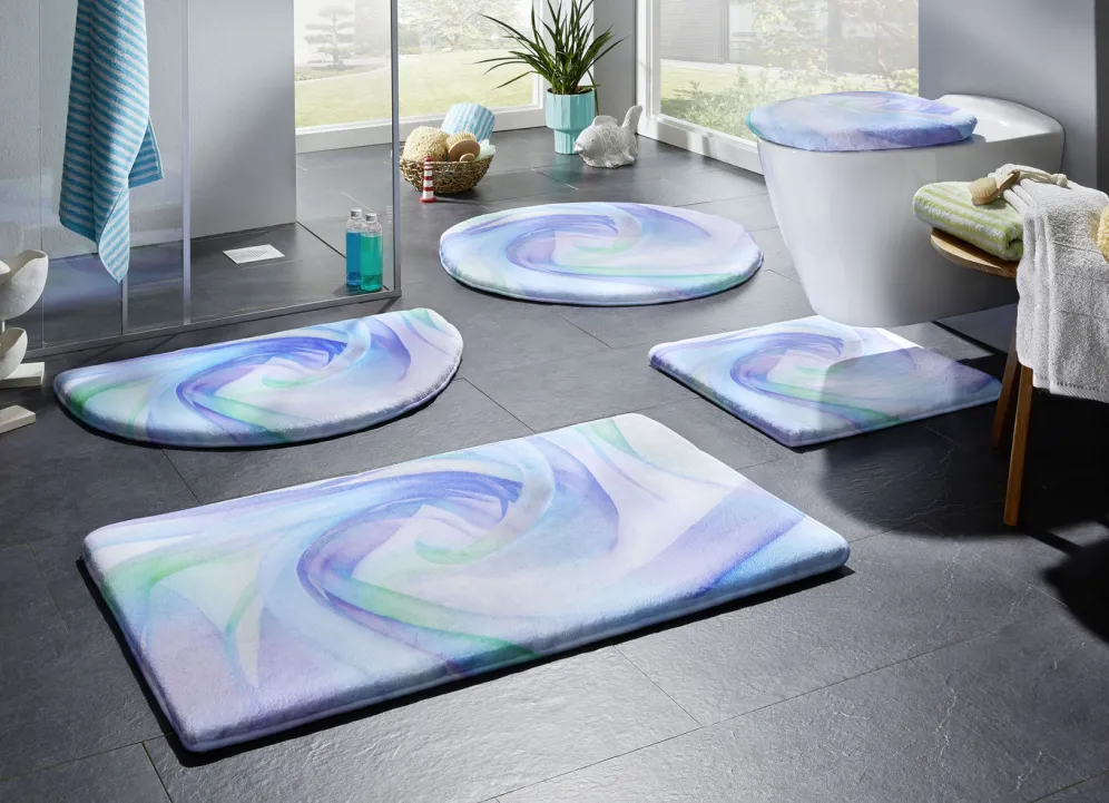 Traumhaft weiche, bedruckte Badvorleger in Größe 112 (Motiv-WC-Deckelbezug, 47/ 50 cm) und in Grün-Violett.