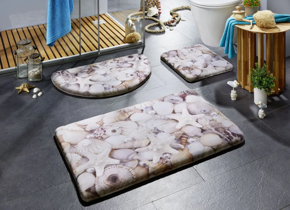 Diese traumhafte Badgarnitur von „Mesana“ bringt dank dem detailreichen Druck mit schönen Muscheln und Seesternen den Strand in Ihr Badezimmer. Höhe: ca. 12 mm. Mit rutschhemmend beschichteter Rückseite und Bandeinfassung gearbeitet. Die barfußweiche Qualität: 100% Polyester. Waschbar bis 30 °C. Für Fußbodenheizung geeignet