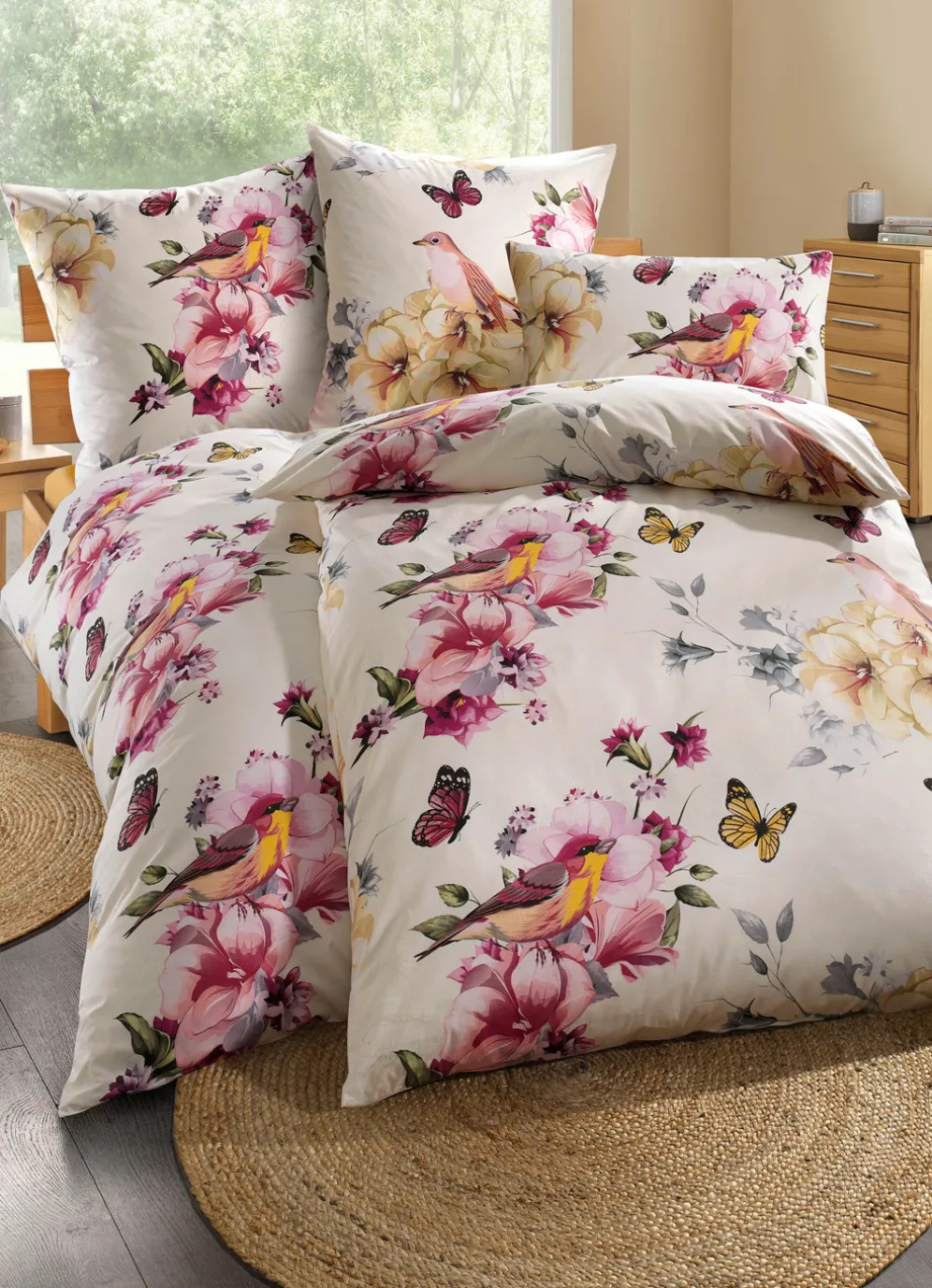 Freuen Sie sich auf traumhaft schöne Nächte und lassen Sie sich von den charmanten, frühlingshaften Dessins dieser beidseitig bedruckten Bettwäsche-Garnituren von „Florella“ beeindrucken. Durch den Pigmentdruck zeigen sich Vögelchen, Blüten und Schmetterlinge in wunderbar leuchtenden Farben und sind ein absoluter Hingucker in Ihrem Schlafzimmer. Mit praktischem Reißverschluss. Waschbar bis 60 °C und trocknergeeignet
