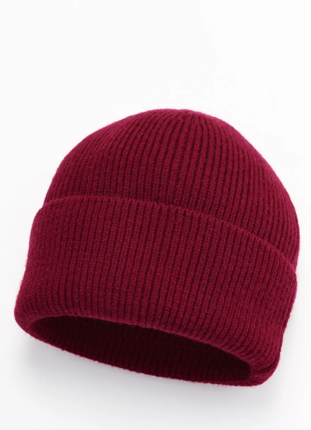 Trendige Feinstrick-Mütze in Bordeaux mit breitem Umschlag. Die Qualität: 100% Polyacryl. In Universalgröße