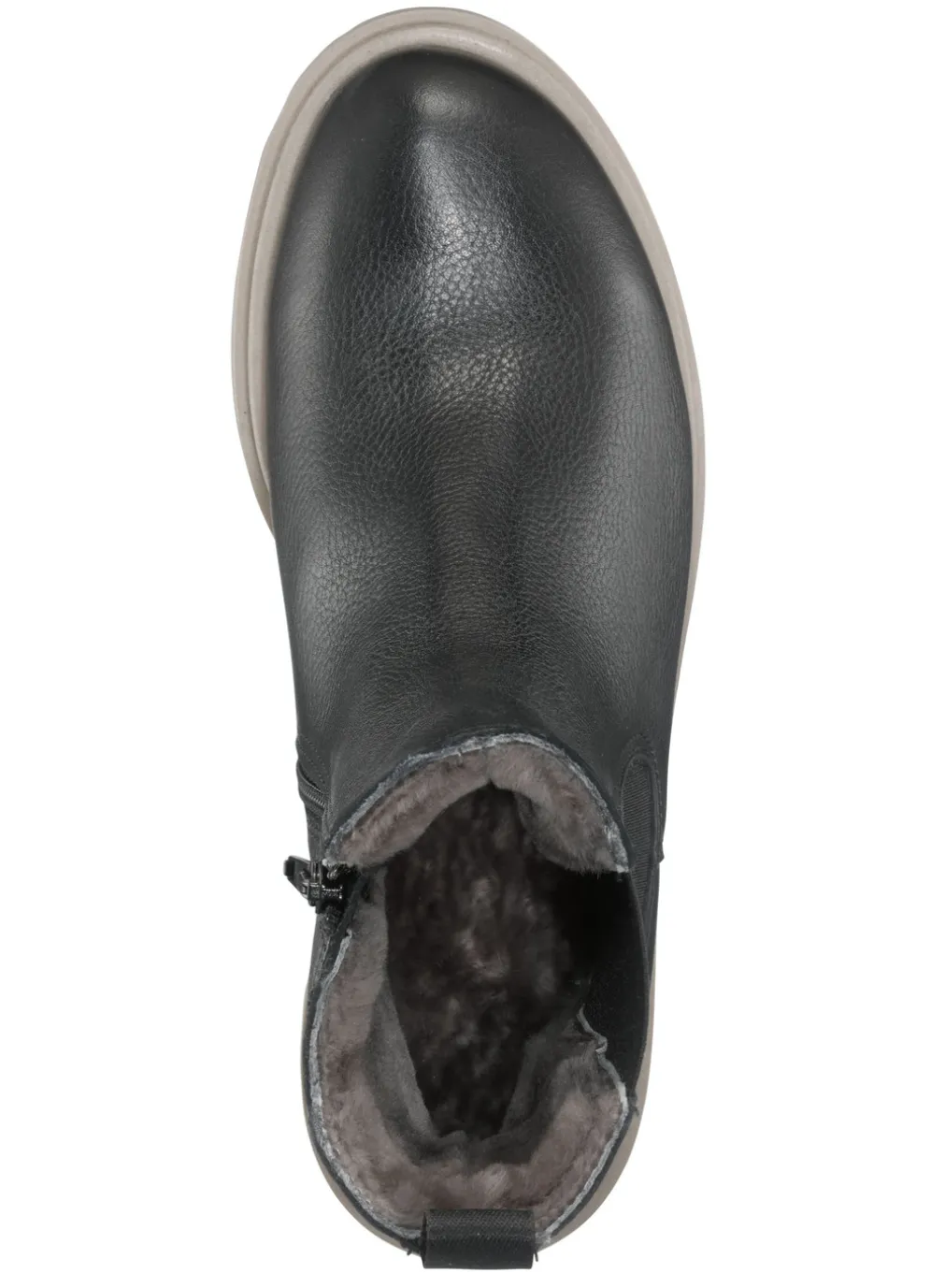 Trendige Stiefelette aus edlem, genarbtem Nubukleder, in Schwarz aus Nappaleder, mit seitlichem Elastikeinsatz und praktischem Innenreißverschluss: in Weite G, echtes, kuscheliges Lammfellfutter mit Lammfelldecksohle, robuste Synthetik-Profilsohle sowie 20 mm Absatz. Schafthöhe ca. 15 cm