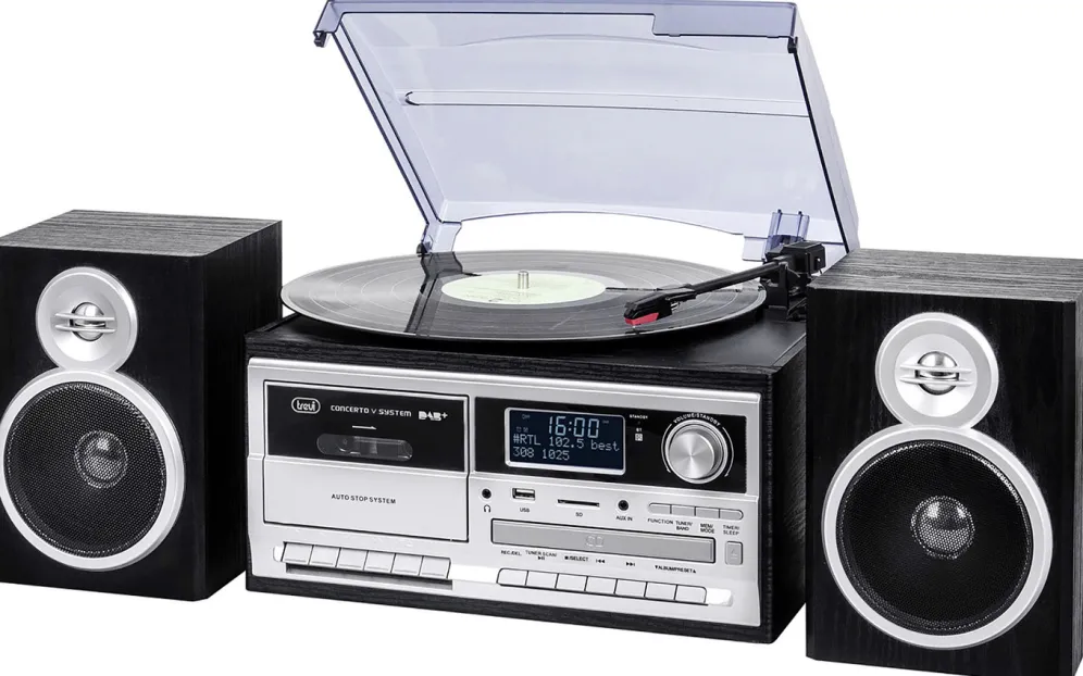 Trevi TT 1072 DAB. Diese Nostalgie-Stereoanlage ist das perfekte Gerät um Ihre Lieblingsmusik von unterschiedlichen Medien abzuspielen. Das Radio ermöglicht Ihnen den Empfang von herkömmlichem UKW-Radio bzw. dank FM- und DAB+ Empfang können Sie eine Vielzahl an Radiosendern hören und gleichzeitig bis zu 30 davon abspeichern. 25 Watt maximale Musikleistung. Plattenspieler: 33/45 U/min sowie CD-Spieler. MP3-Dateien abspielbar von CDs, USB- und SD-Kartenslot. Kabellose Musikwiedergabe von Smartphone oder Tablet dank Bluetooth-Funktion. Kassettendeck mit Full Encoding-Funktion: Aufnahme direkt auf USB oder SD-Karte und mit Autostopp-Funktion.