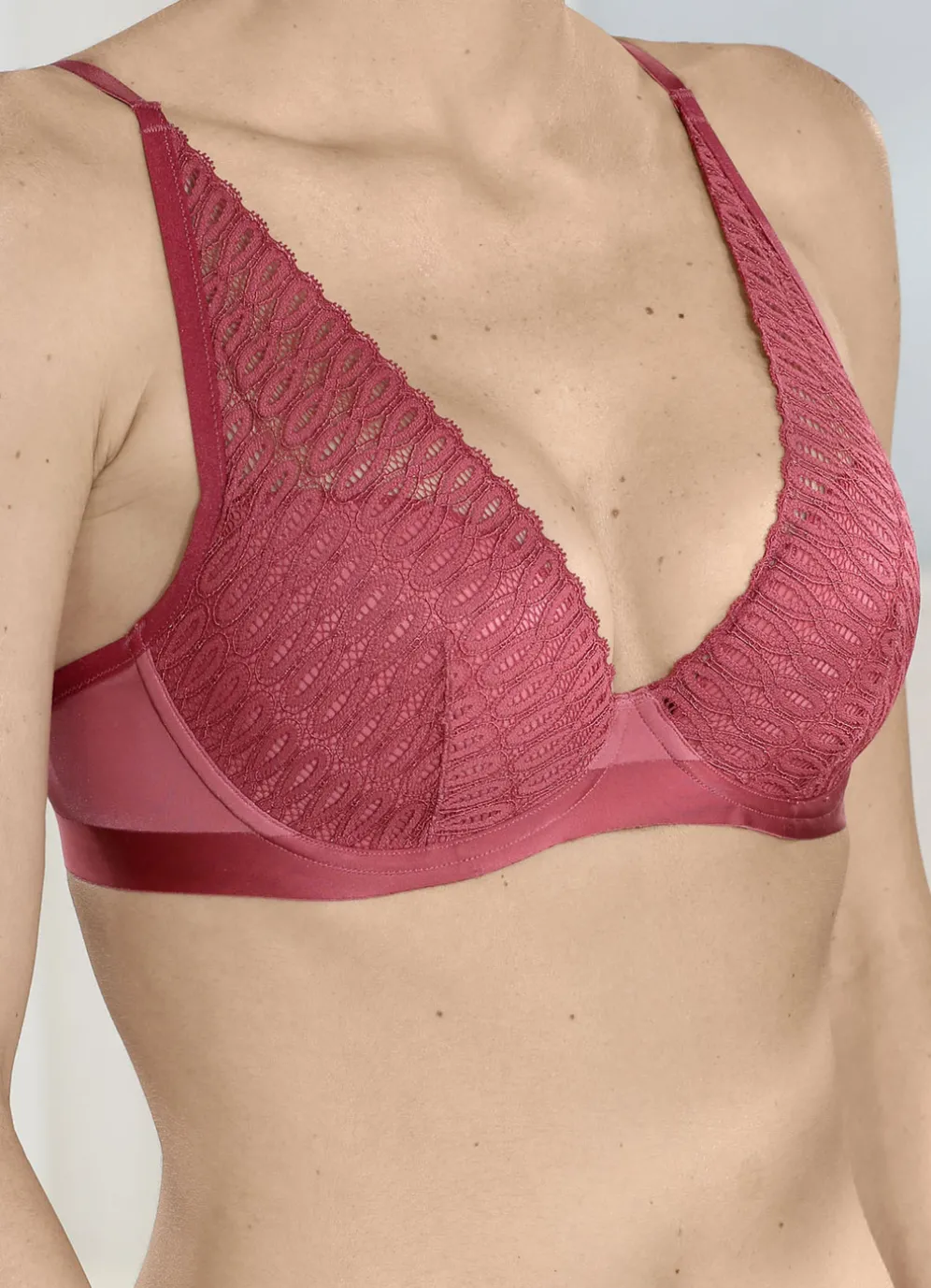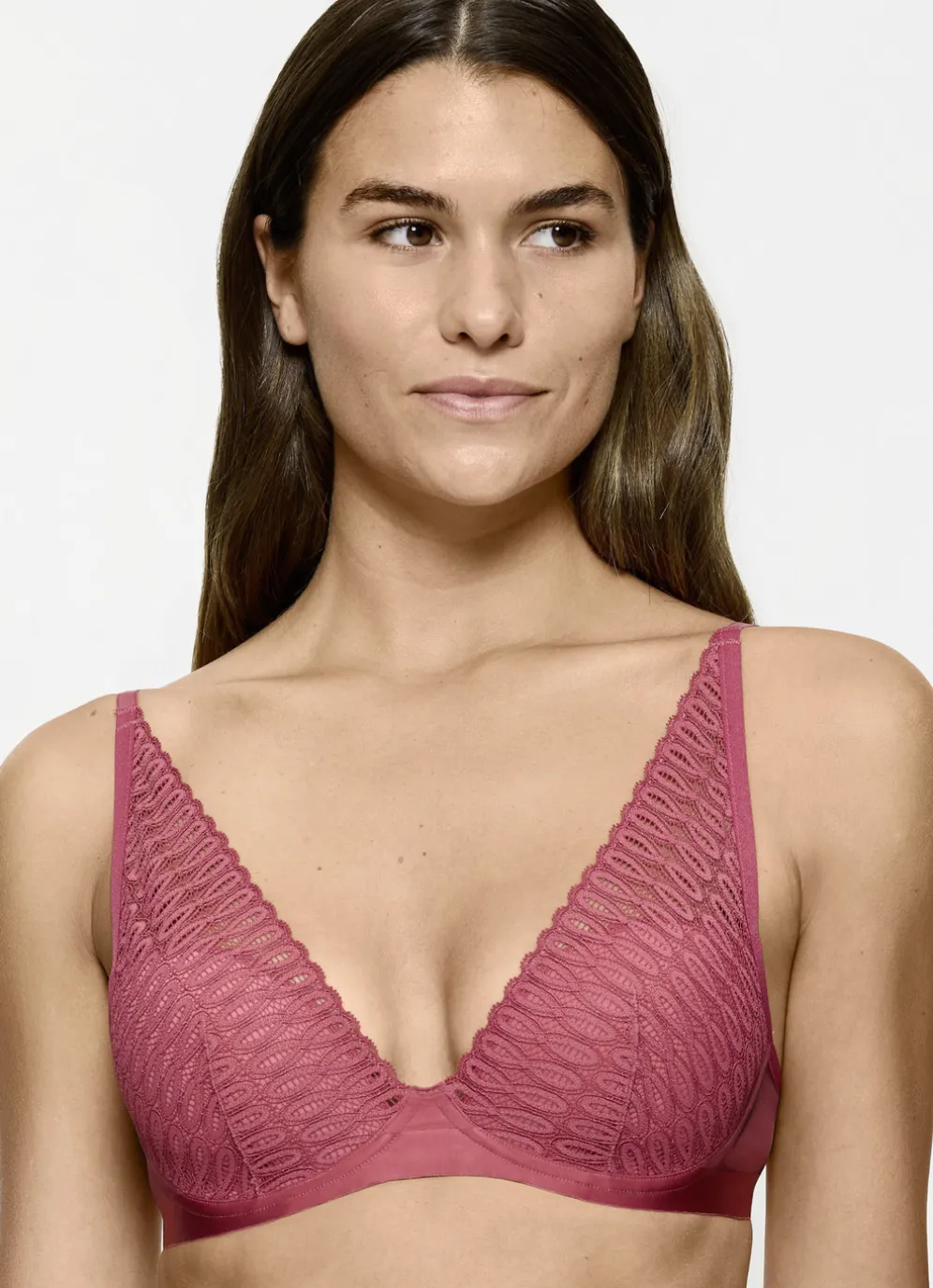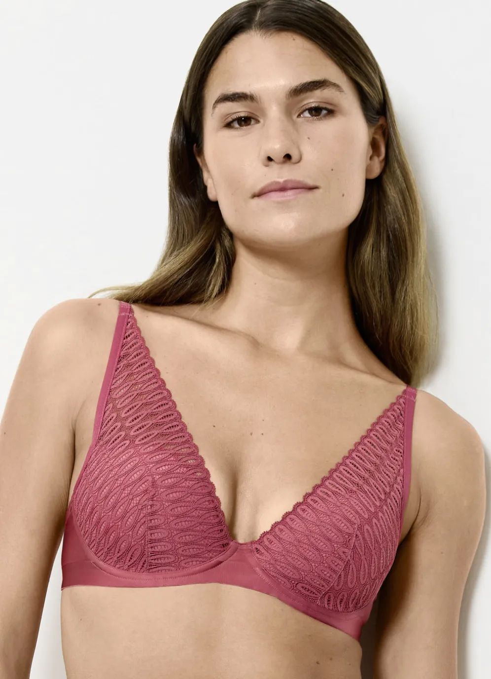 Korallefarbener „Triumph-Aura Spotlight“-Bügel-BH mit Elastikspitze im Vorderteil, weich gepolsterten, vorgeformten Cups, unterlegtem Rückteil sowie verstellbaren Stretchträgern.