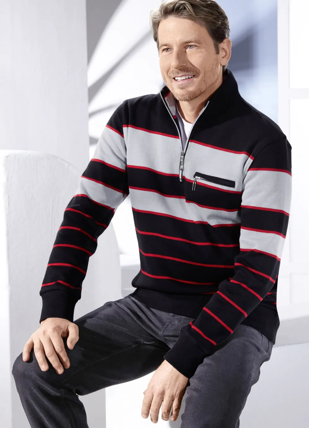 Gönnen Sie sich mit diesem herrlichen Troyer in Schwarz-Grau-Rot ein Modell der Extraklasse! Mit kurzem Reißverschluss, einer Brusttasche links mit Reißverschluss sowie elastischen Bündchen- Abschlüssen an den Ärmeln und am Saum.