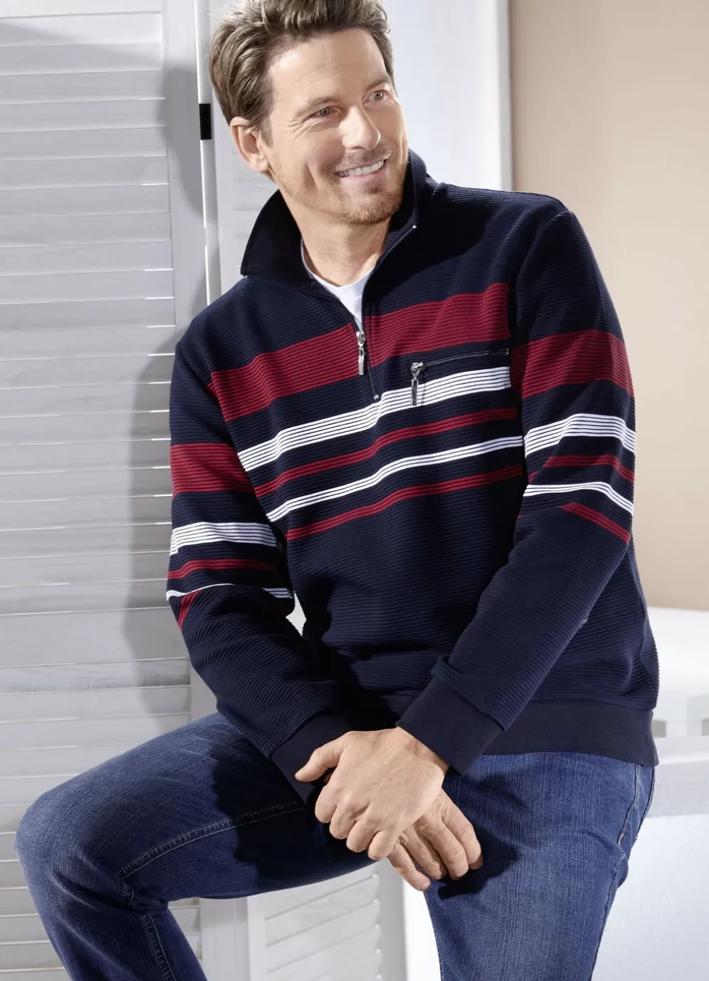 Ein modisches Highlight ist dieser legere Troyer in Marine-Bordeaux-Weiß, mit kurzem Reißverschluss, einer Brusttasche mit Reißverschluss sowie elastischen Bündchen-Abschlüssen an den Ärmeln und am Saum.