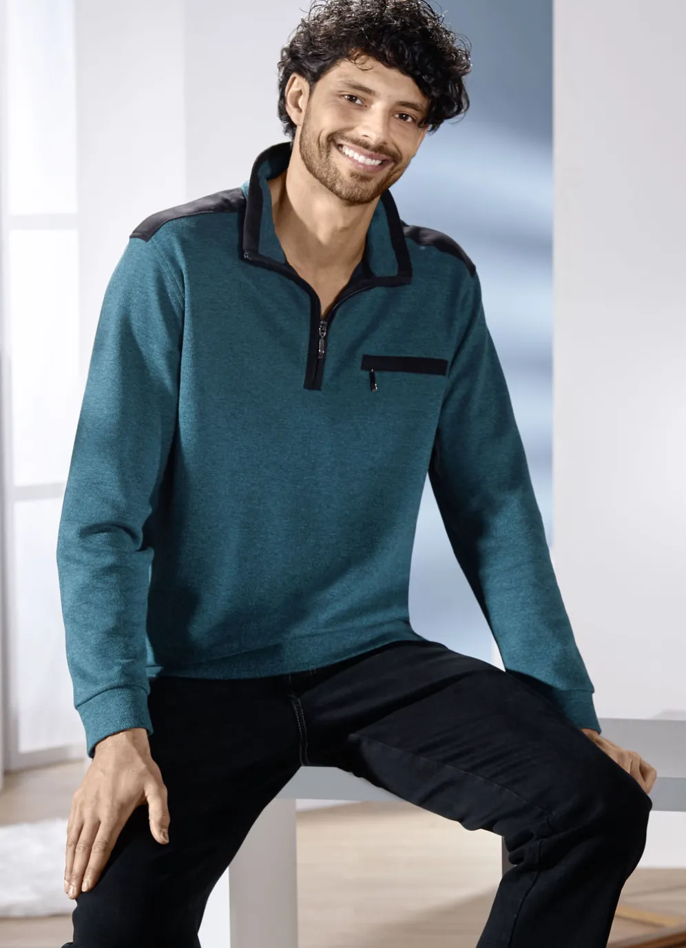 Einen markanten Hingucker erhalten Sie mit diesem petrol melierten Troyer mit kurzem Reißverschluss, Kontrastbesatz an den Schultern, einer Brusttasche links mit Reißverschluss sowie elastischen Bündchen-Abschlüssen an den Ärmeln und am Saum.