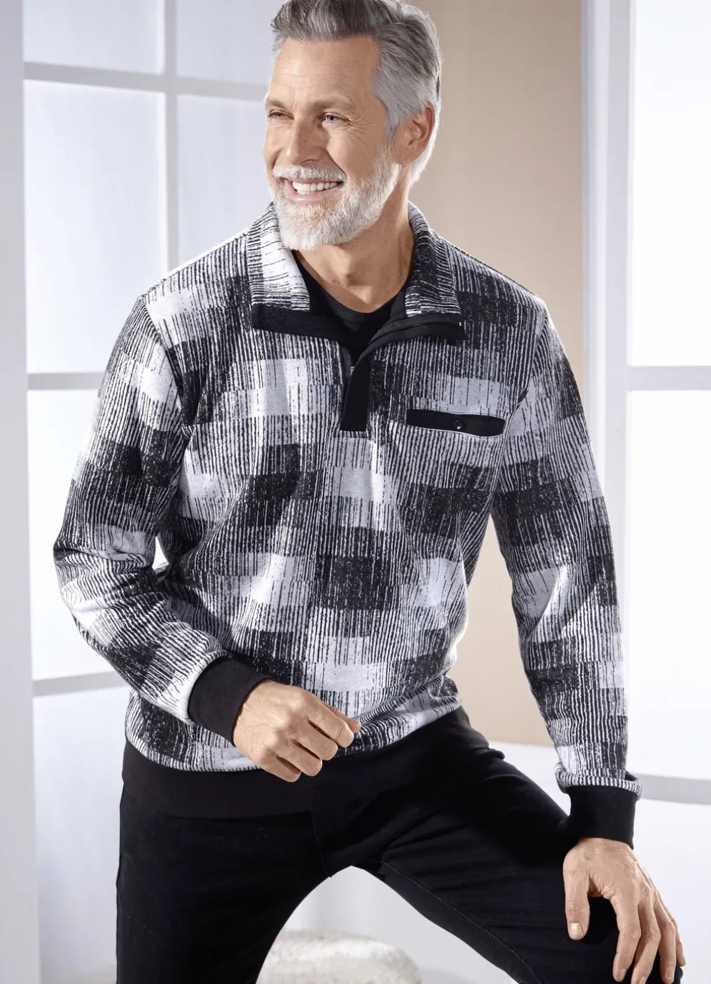 Mit ausdrucksstarkem Dessin in Silbergrau-Schwarz: Troyer mit kurzem Reißverschluss, einer knöpfbaren Brusttasche links sowie elastischen Bündchen-Abschlüssen an den Ärmeln und am Saum.