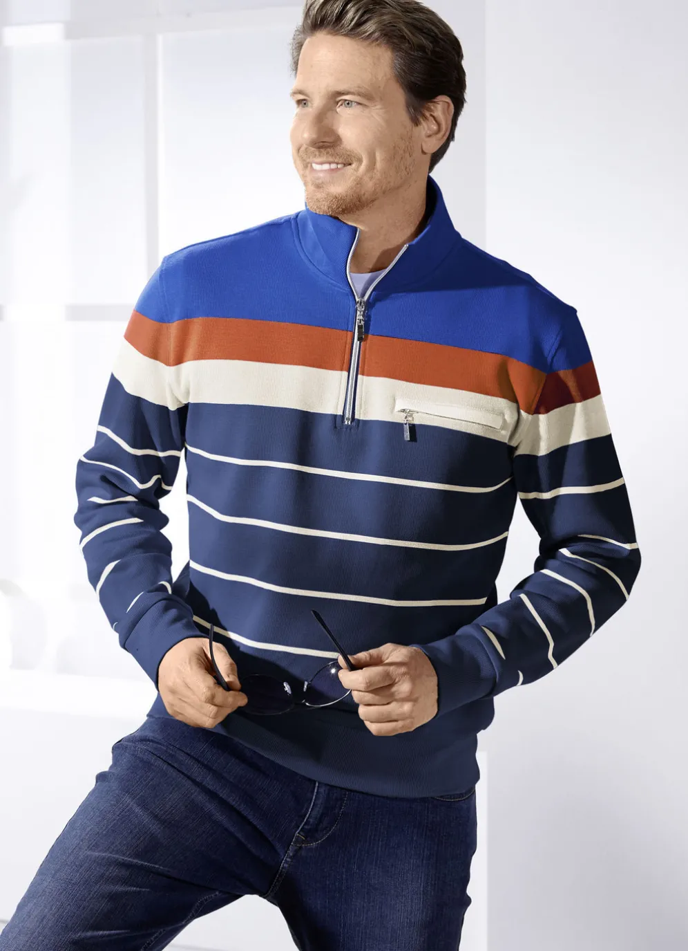 Legerer Troyer in Marine-Royalblau-Beige-Terra, mit kurzem Reißverschluss, einer Reißverschluss-Brusttasche links sowie elastischen Bündchen-Abschlüssen an den Ärmeln und am Saum.