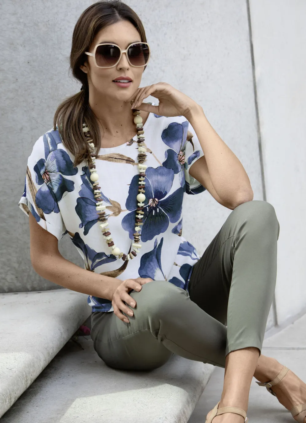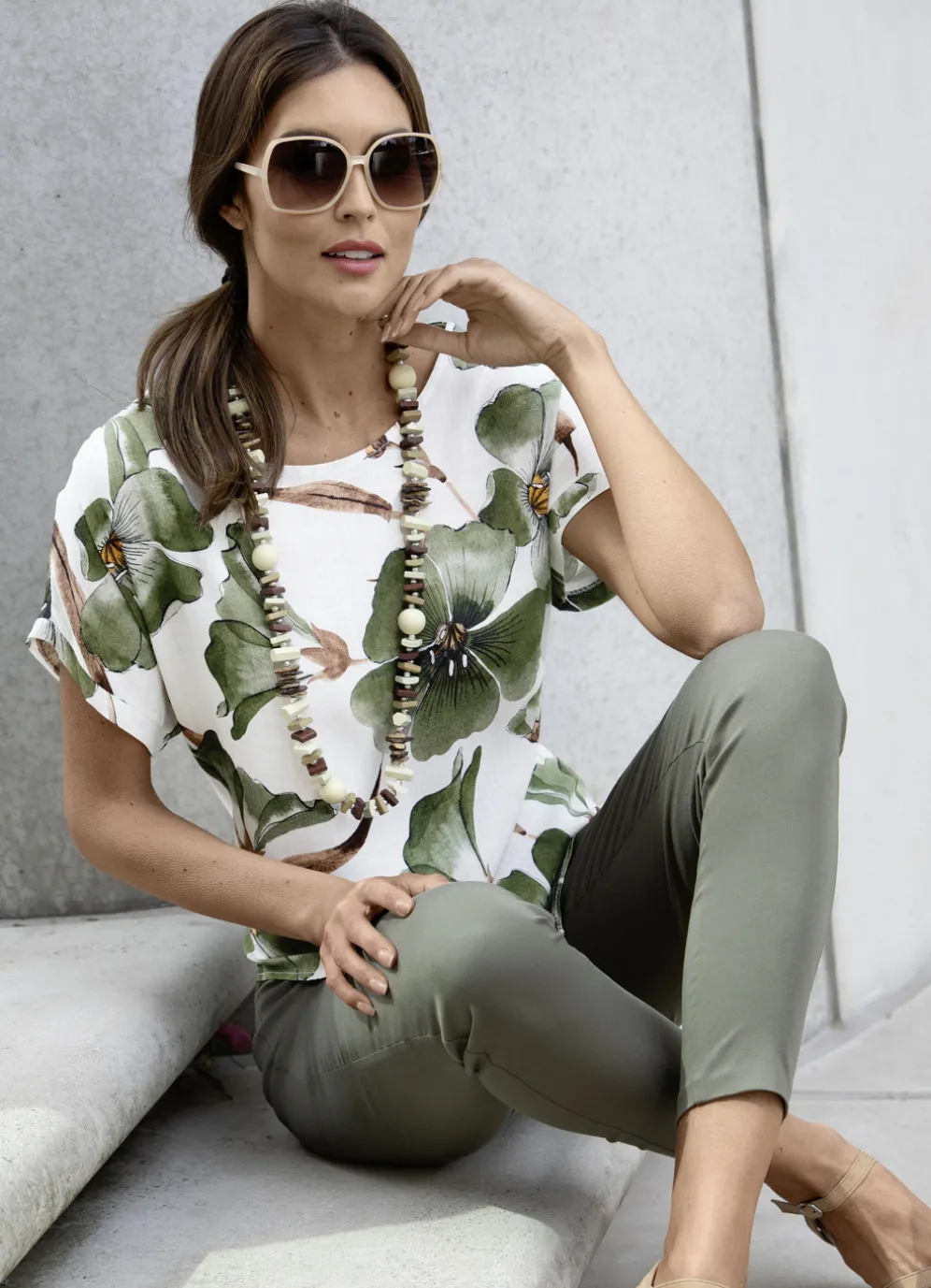 Schöne Tunika in Weiß-Oliv-Braun-Bunt, mit rundem Halsausschnitt, Zierknöpfen im Rückteil, kurzen überschnittenen Ärmeln, abgerundetem Saum sowie länger geschnittenem Rückteil.