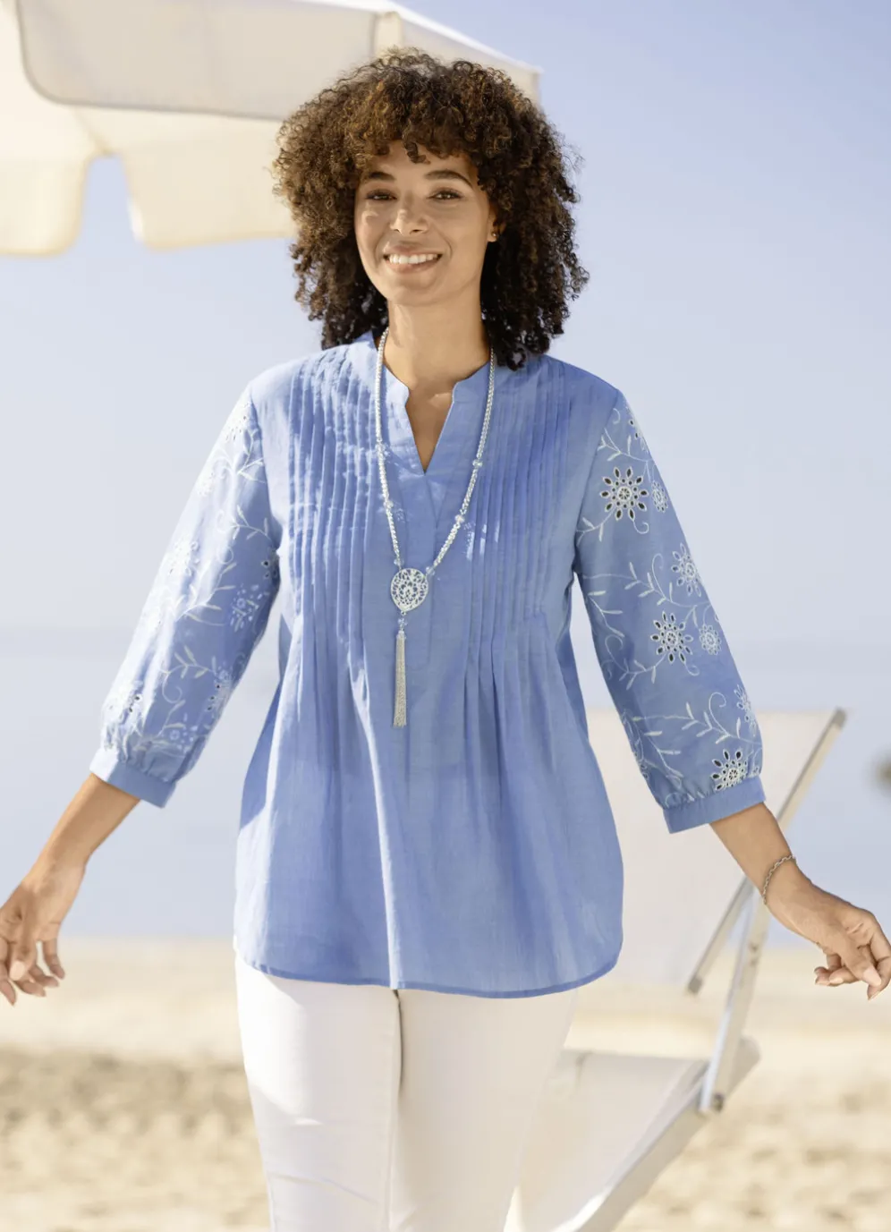 Schicke Tunika mit Schlitz am Stehkragen, dekorativer Biesenzier mit aufspringenden Fältchen im Vorderteil, hübscher, weißer Lochstickerei an den 3/4-langen Ärmeln mit schmalen Bündchen, Rückenpasse sowie leicht abgerundetem Saum.