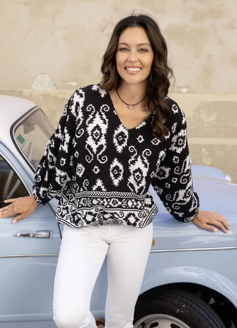 Schwarz-ecrufarbene Tunika mit schönem Bordüren-Druck, V-Ausschnitt, elastischen Abschlüssen an den langen Ärmeln sowie elastischem Saumabschluss rundum.
