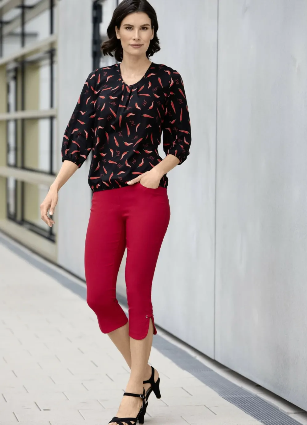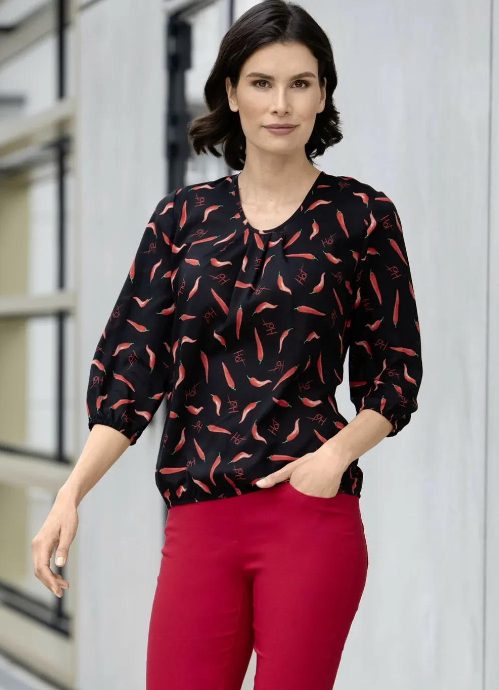 Mit farbbrillantem, schwarz-rot-grünem Inkjet-Druck ausgestattet ist diese Tunika mit V-Ausschnitt, elastischen Abschlüssen an den 3/4-langen Ärmeln sowie am Saumabschluss rundum.
