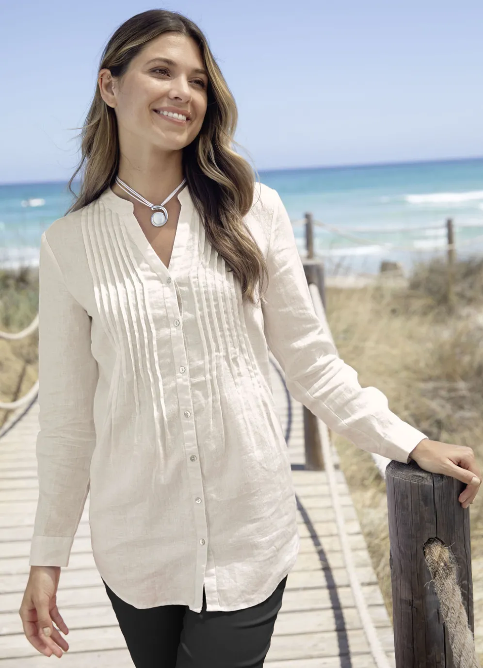 Schöne Tunika in Sand, mit V-Ausschnitt am Stehkragen, Schmuckknöpfen an der Schlingenknopfleiste, Riegel und Knopf an den langen, auf 3/4-Länge krempelbaren Manschettenärmeln, Rückenpasse, Biesenzier mit aufspringenden Fältchen im Vorder-und Rückteil sowie abgerundetem Saum.
