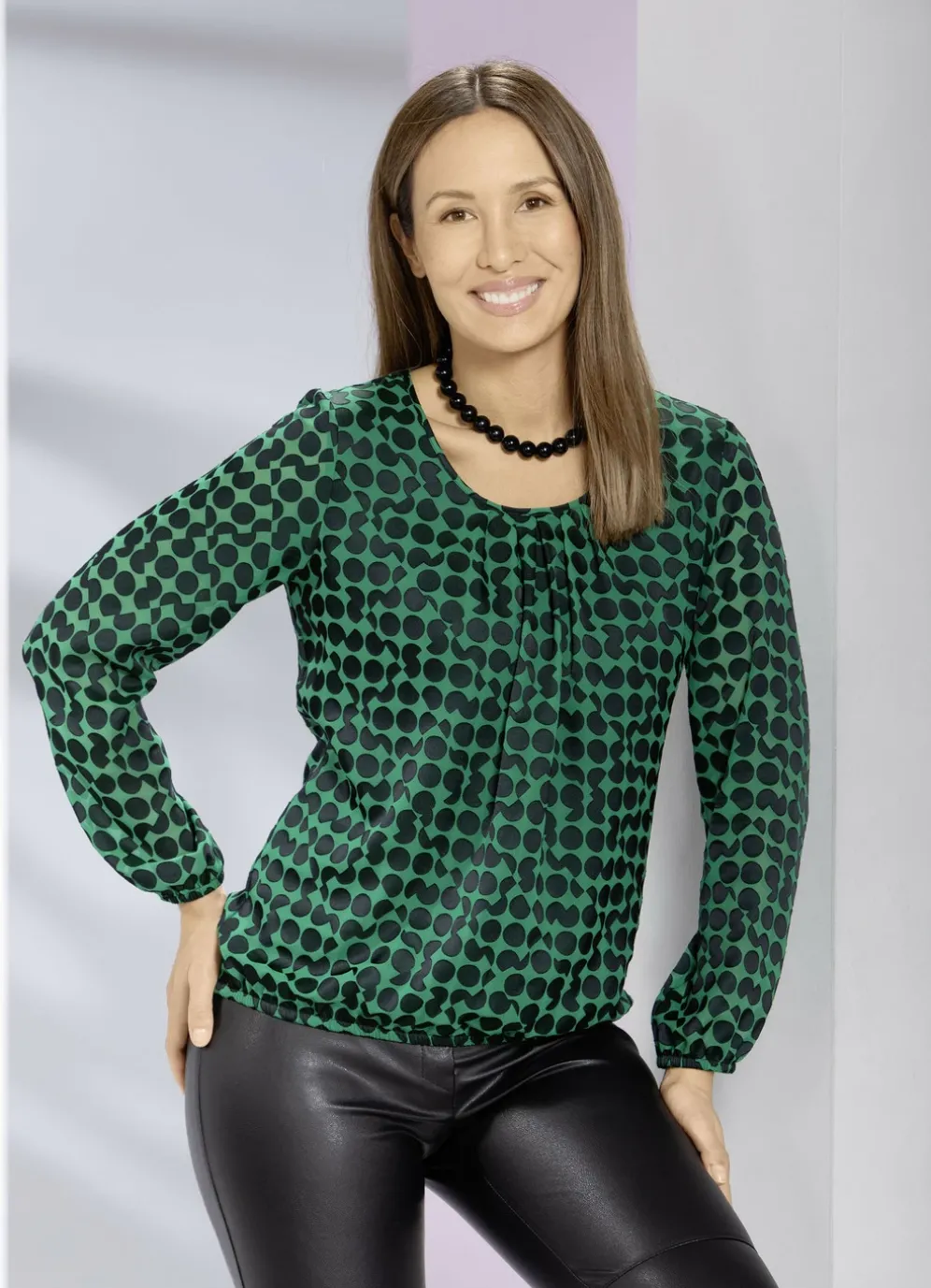 Schicke, unterlegte, grün-schwarze Tunika mit Tupfen und gefälteltem, rundem Halsausschnitt, transparenten, langen Ärmeln mit elastischen Abschlüssen sowie elastischem Saumabschluss rundum.