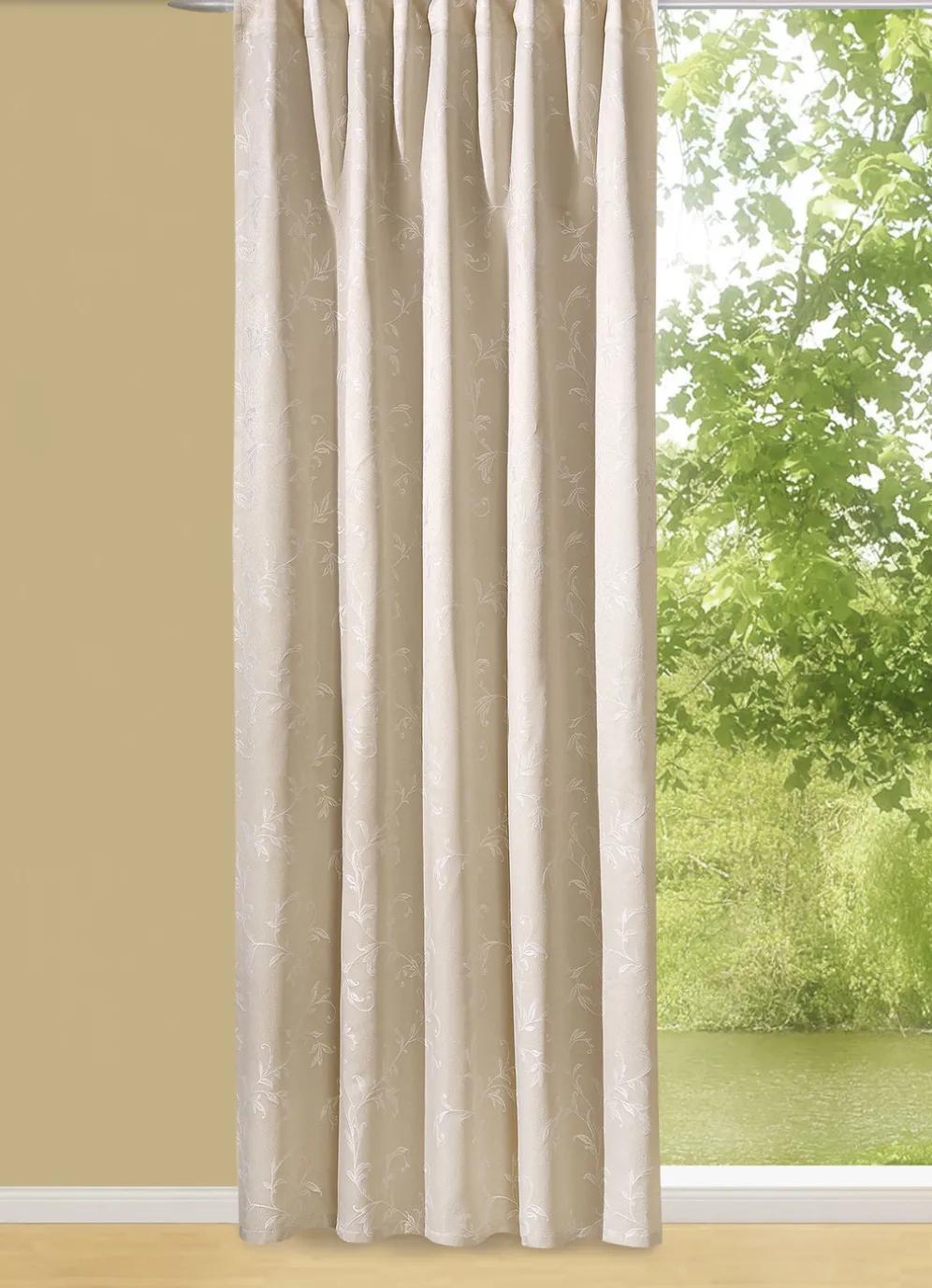 Übergardine mit Ranken-Motiv in Größe 365 (145×140 cm) und in Beige.
