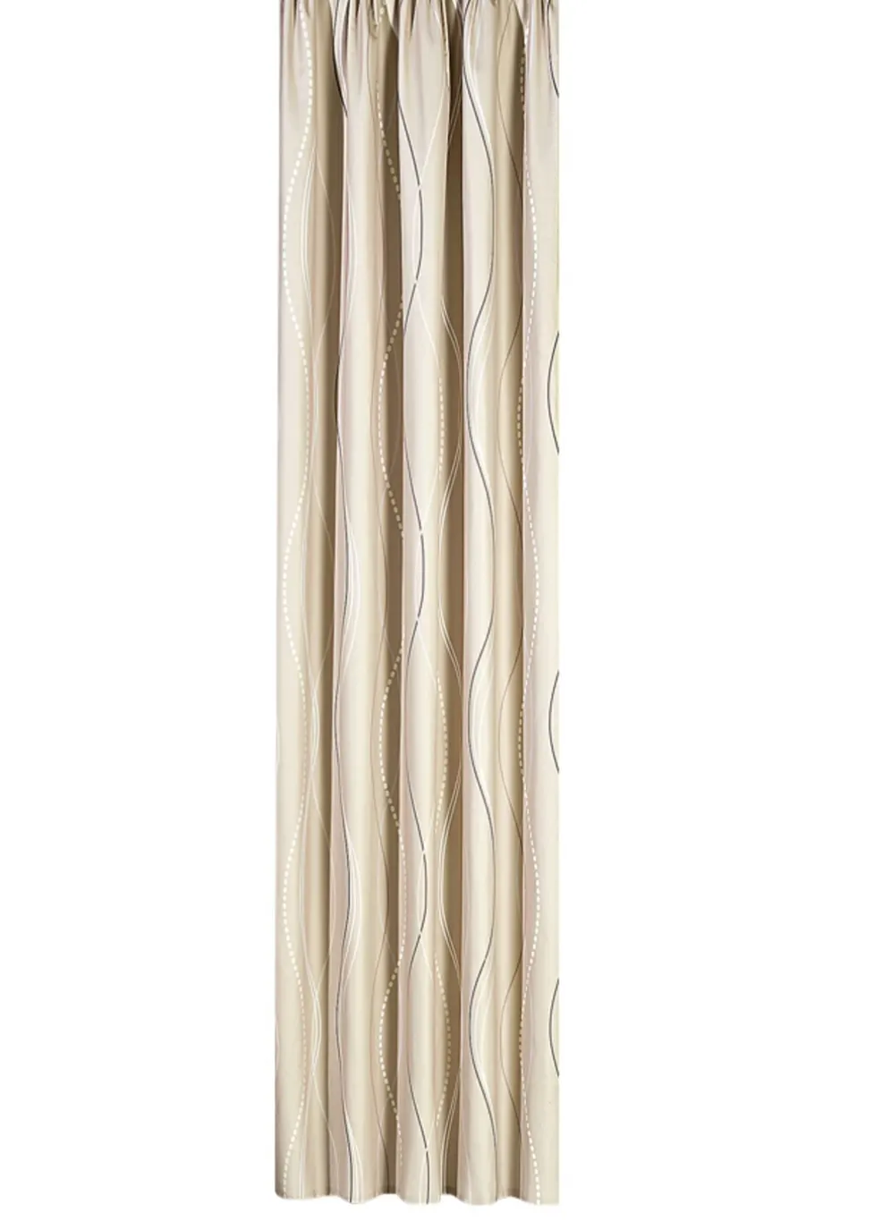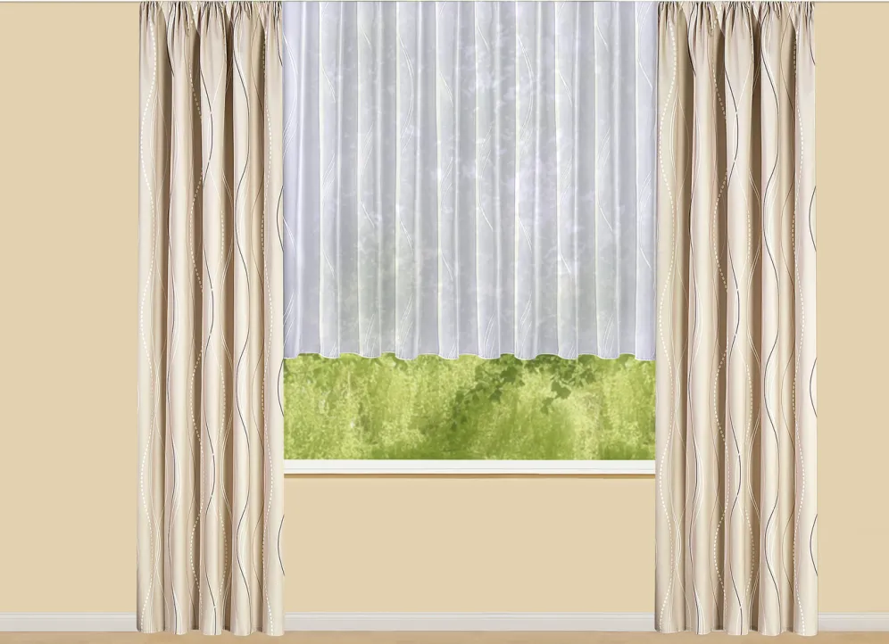 Übergardine mit Wellen-Dessin und Universalschienenband in Größe 364 (Dekoschal, 150×132 cm) und in Beige.