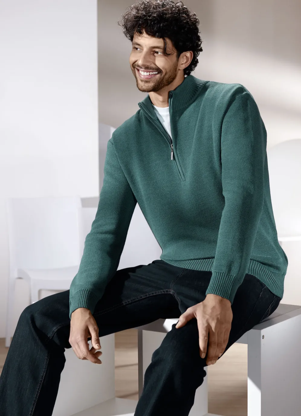 Ein markanter Hingucker ist dieser unifarbene Stehkragenpullover mit langen Ärmeln, kurzem Reißverschluss sowie Rippenstrick-Abschlüssen.