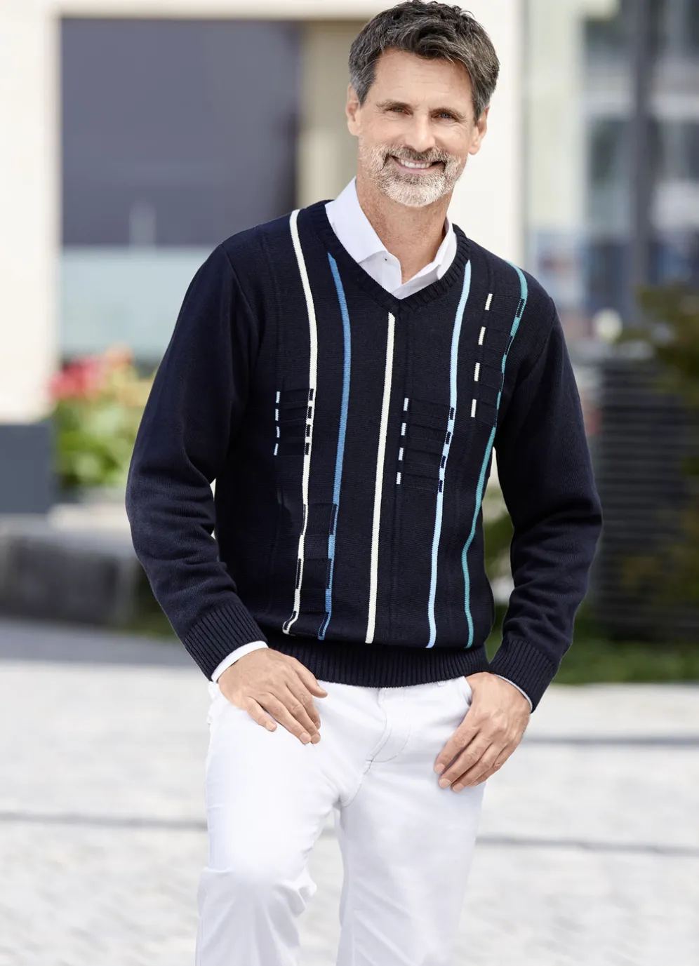 Ein Modell der Extraklasse ist dieser V-Pullover mit klassischem Strukturdessin im Vorderteil sowie Rippenstrick-Abschlüssen.