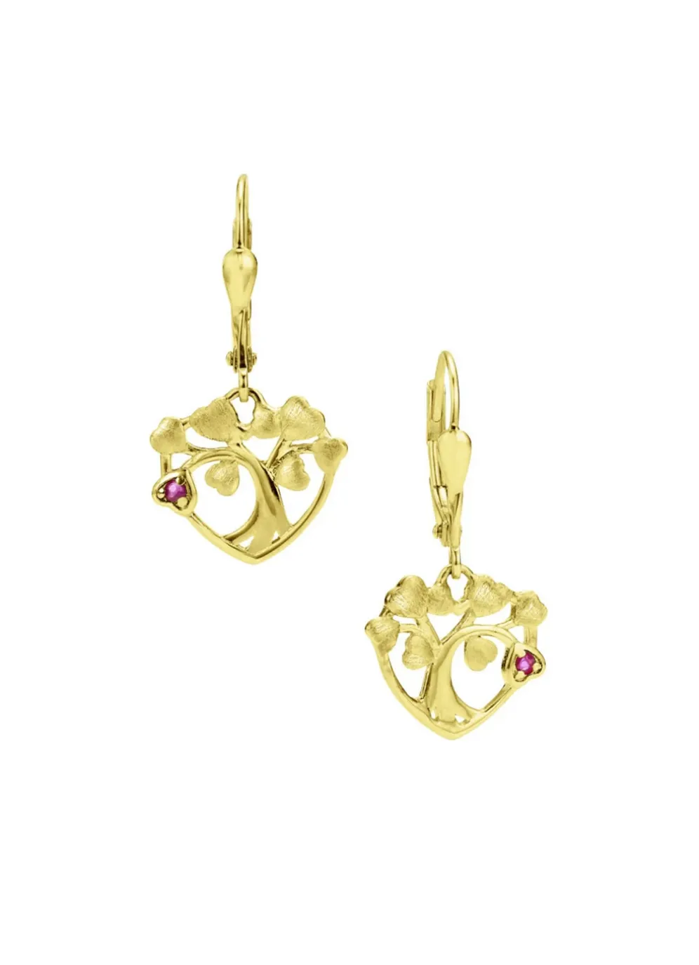 Diese vergoldeten Ohrringe aus Silber 925/- fein symbolisieren die Verbundenheit mit dem Herzen und die Liebe zur Natur. Das herzförmige Schmuckstück, das von einem Baum umgeben ist, wird mit einem echten Rubin geschmückt. Die Kombination aus glänzenden und mattierten Oberflächen verleiht dem Ohrschmuck eine interessante Textur und Tiefe. Mit einer Länge von ca. 27 mm passen die Ohrringe im Büro ebenso wie in der Freizeit oder zu einem festlichen Anlass.