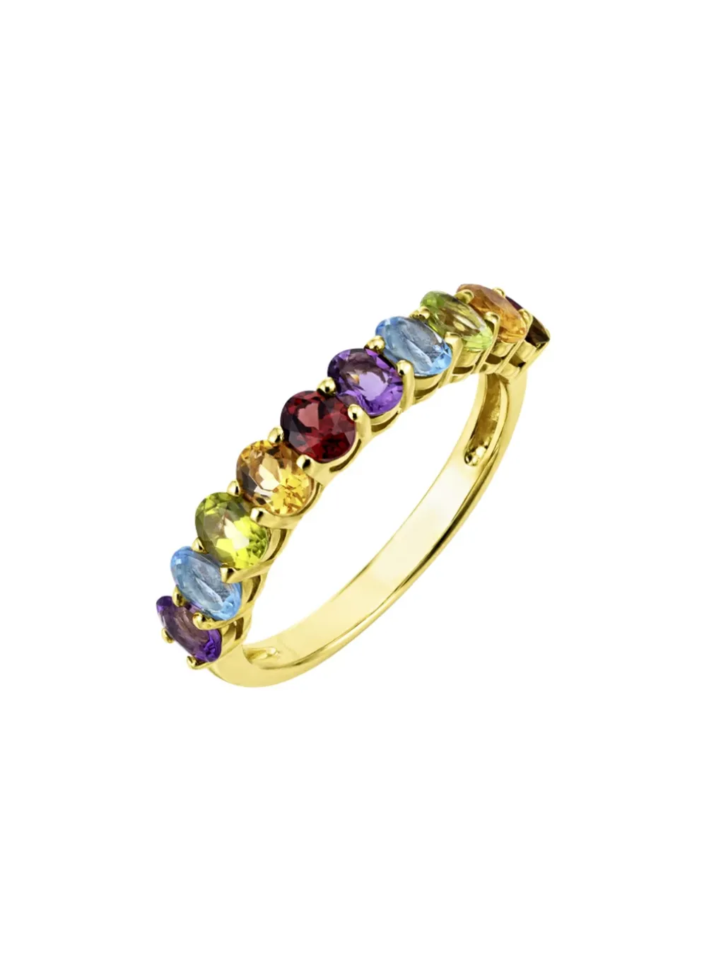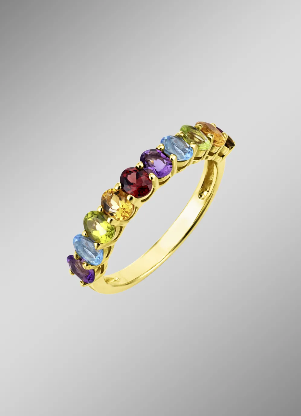 Dieser wunderschöne Damenring aus Silber 925/- fein ist ein echter Hingucker. Der Ring ist mit verschiedenen Edelsteinen wie Blautopas beh., echt Amethyst, echt Citrin, echt Peridot und echt Granat besetzt, die dem Ring eine besondere Eleganz verleihen. Der Ring hat einen Durchmesser von 4 mm und ist vergoldet.