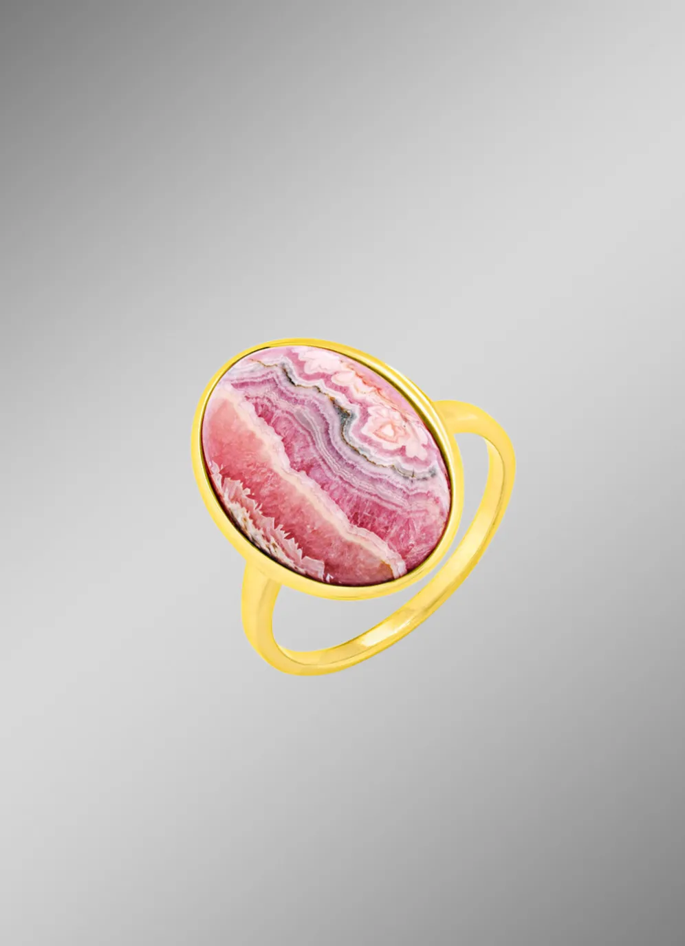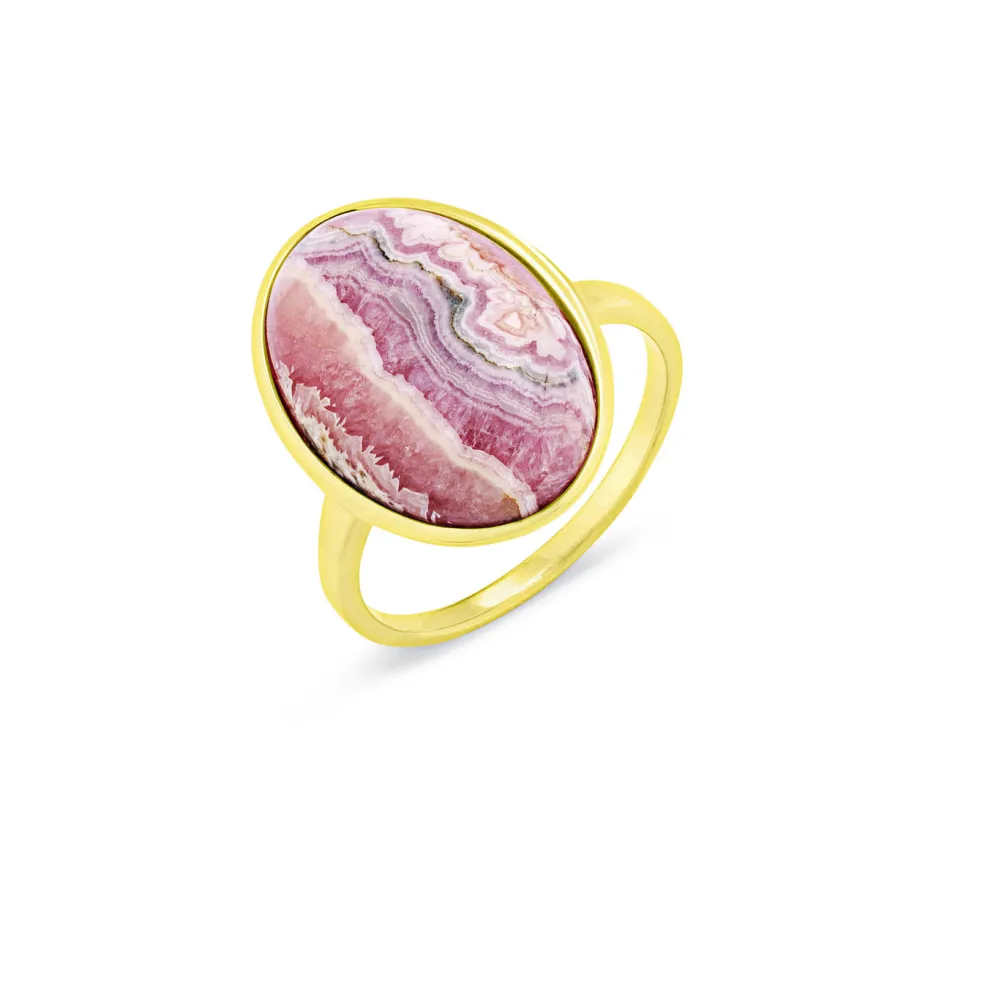 Ein wunderschöner, echter Rhodochrosit glänzt an diesem vergoldeten Damenring aus Silber 925/- fein und besticht durch schlichte Eleganz. Das Schmuckstück mit einer Ringkopfgröße von 20 mm lässt sich zu verschiedenen Outfits tragen und sorgt für strahlende Momente.