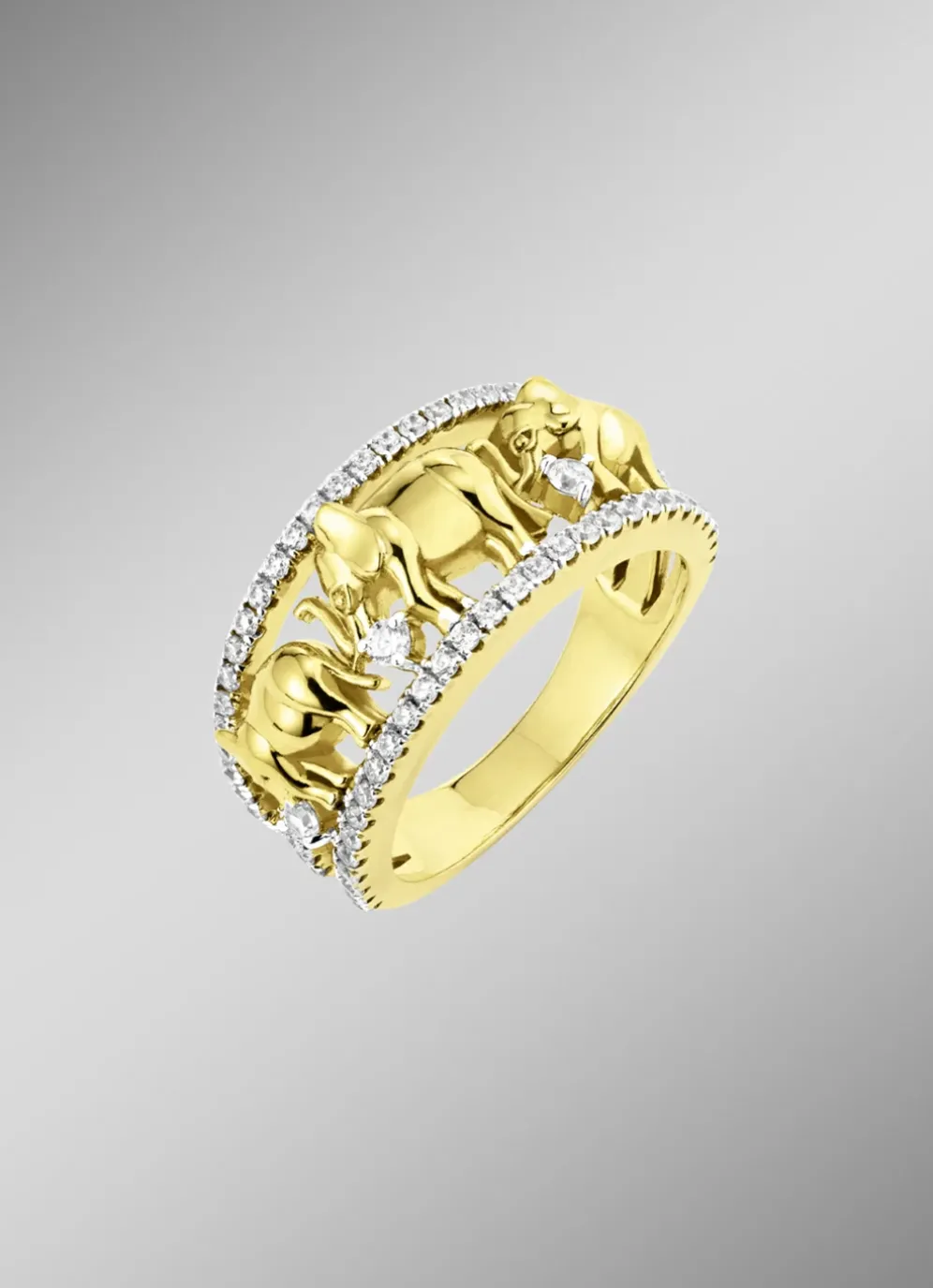 Dieser wunderschöne Damenring ist ein perfektes Geschenk für Ihre Liebsten oder für sich selbst. Der Ring besteht aus Silber 925/- fein und ist vergoldet. Der Ring hat eine Ringbreite von 11 mm und ist durchbrochen. Der Ring ist mit synthetischen Zirkonia besetzt, die ihm ein funkelndes Aussehen verleihen. Der Ring ist mit drei Elefanten verziert, die ihm eine einzigartige Note verleihen.