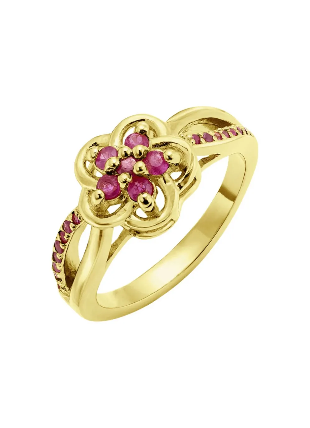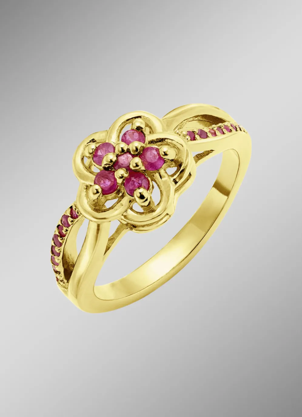 Dieser vergoldete Damenring aus Silber 925/- fein mit echtem Rubin präsentiert ein bezauberndes Blumendesign. Der ca. 10 mm große Ringkopf verleiht dem Schmuckstück eine auffällige Präsenz und strahlt zeitlose Eleganz aus. Lassen Sie sich inspirieren und setzen Sie glanzvolle Akzente im Alltag.