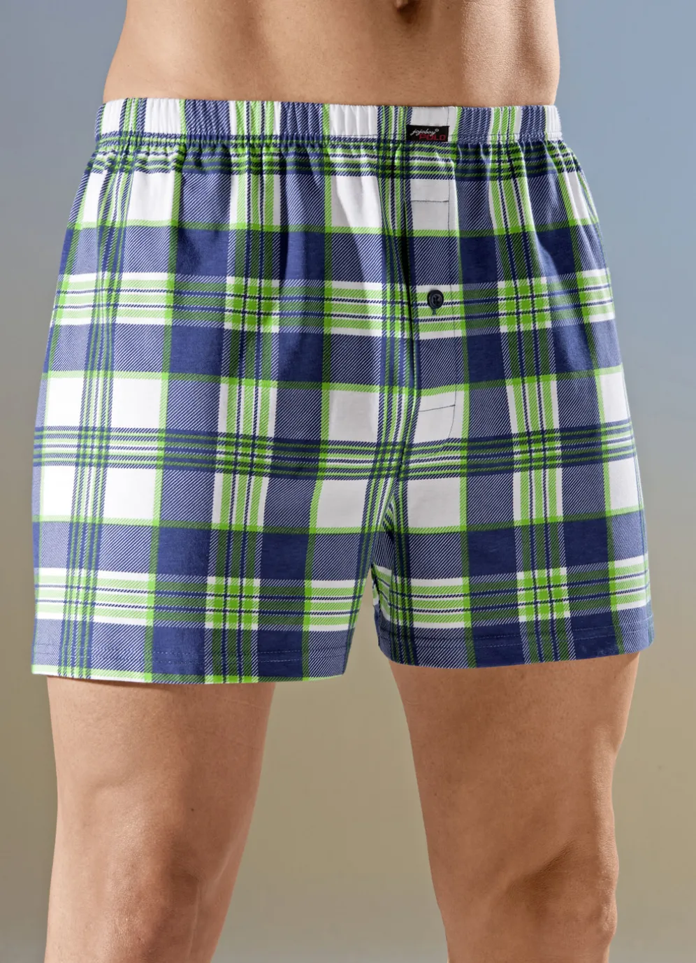 Viererpack Boxershorts mit Karodessin in 2X Marine-Grün-Weiss, 2X Grün-Marine-Weiss und in Größe 6.