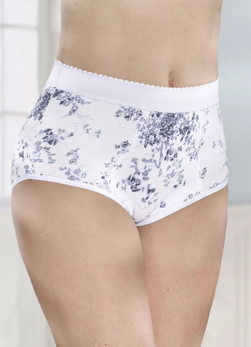 Viererpack Formslips mit verstärkter Bauchpartie in 2X Weiss-Rauchblau Bedruckt, 2X Marine und in Größe 44.