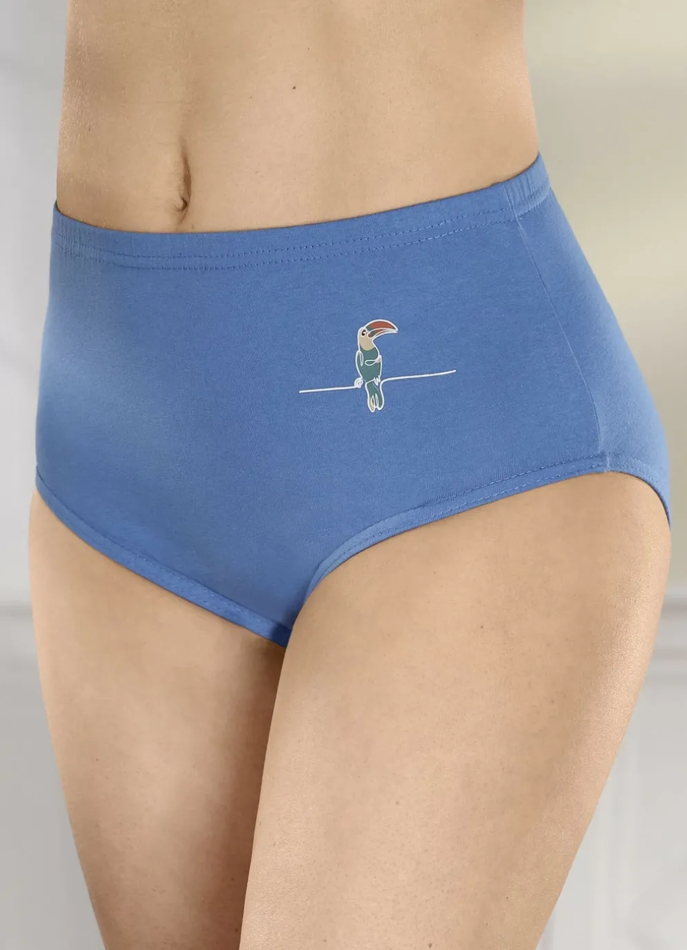 Jeansblauer Slip mit buntem Tier-Motiv im Vorderteil sowie Gummizug im Bund.