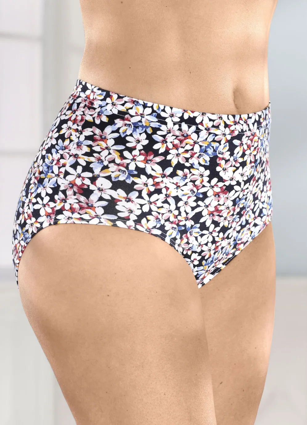 Viererpack Slips mit farbbrillantem Blümchendessin in Marine-Weiss-Bunt und in Größe 42.