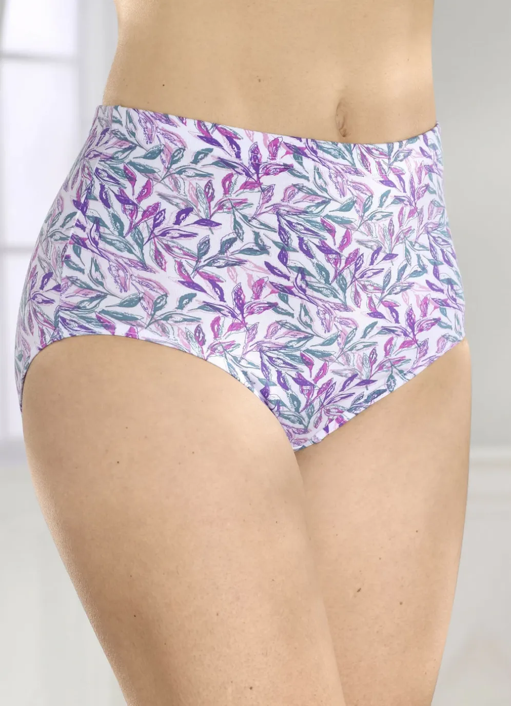 Weißgrundiger Slip mit lila-grün-buntem Druckdessin sowie Gummizug im Bund.
