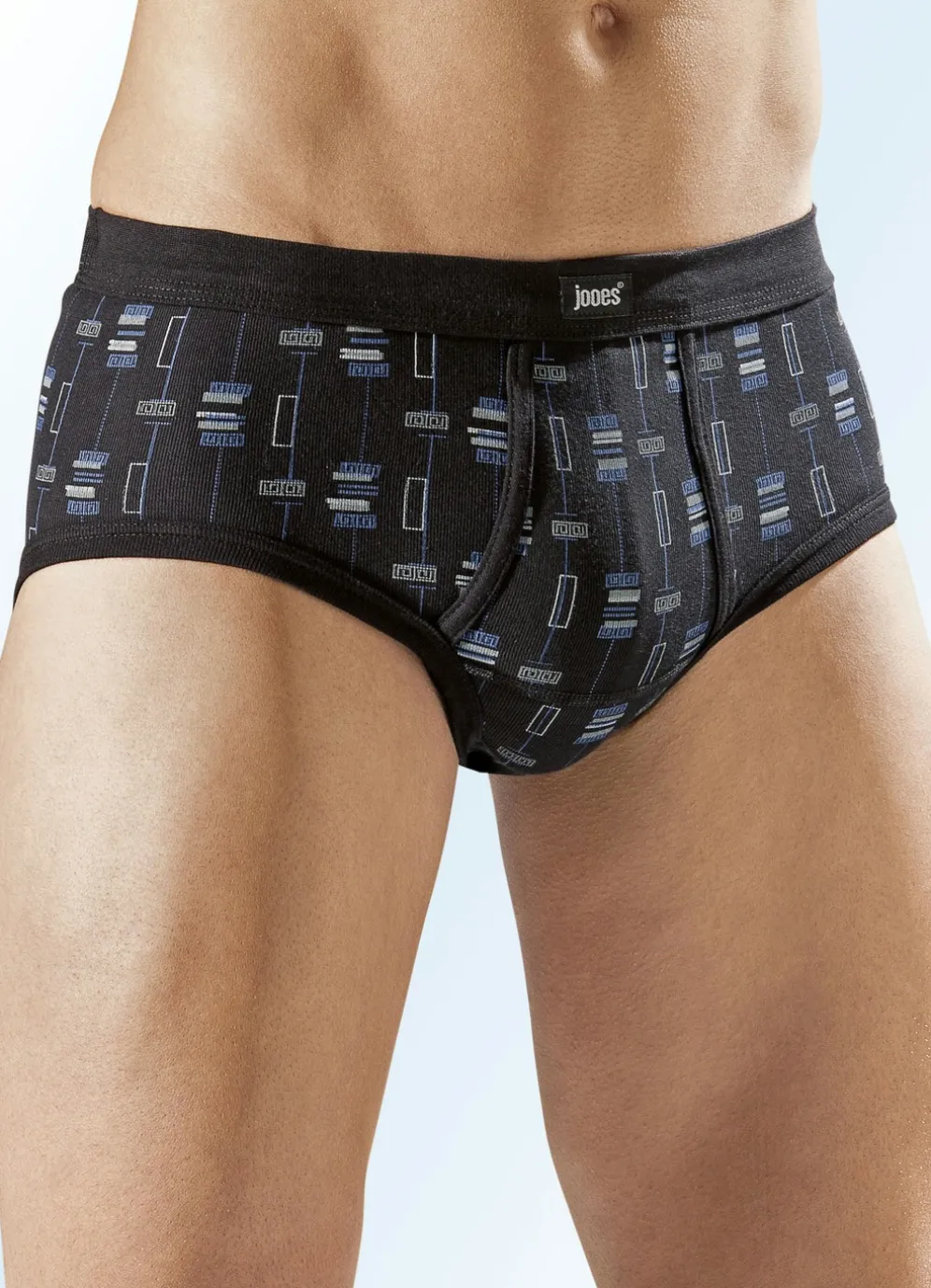 Viererpack Slips mit paspeliertem Eingriff, allover dessiniert in 2X Schwarz-Bunt, 2X Marine-Bunt und in Größe 6.