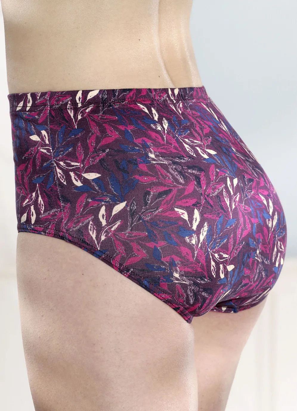 Viererpack Slipsmit Gummizug im Bund in Burgund-Jeansblau-Azalee-Bunt und in Größe 38.