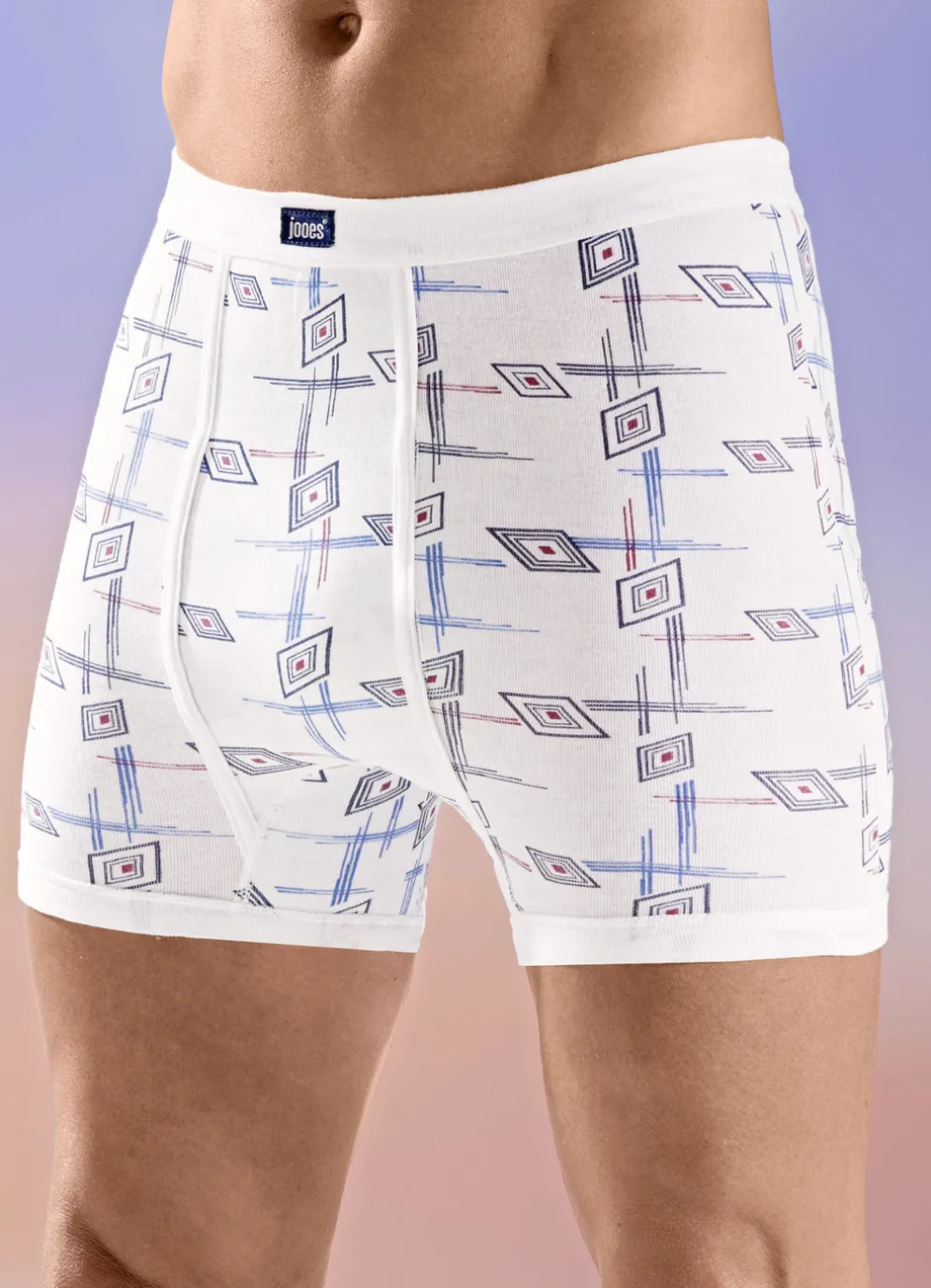 Viererpack Unterhosen mit Alloverdessin in 2X Weiss-Bunt, 2X Marine-Bunt und in Größe 6.