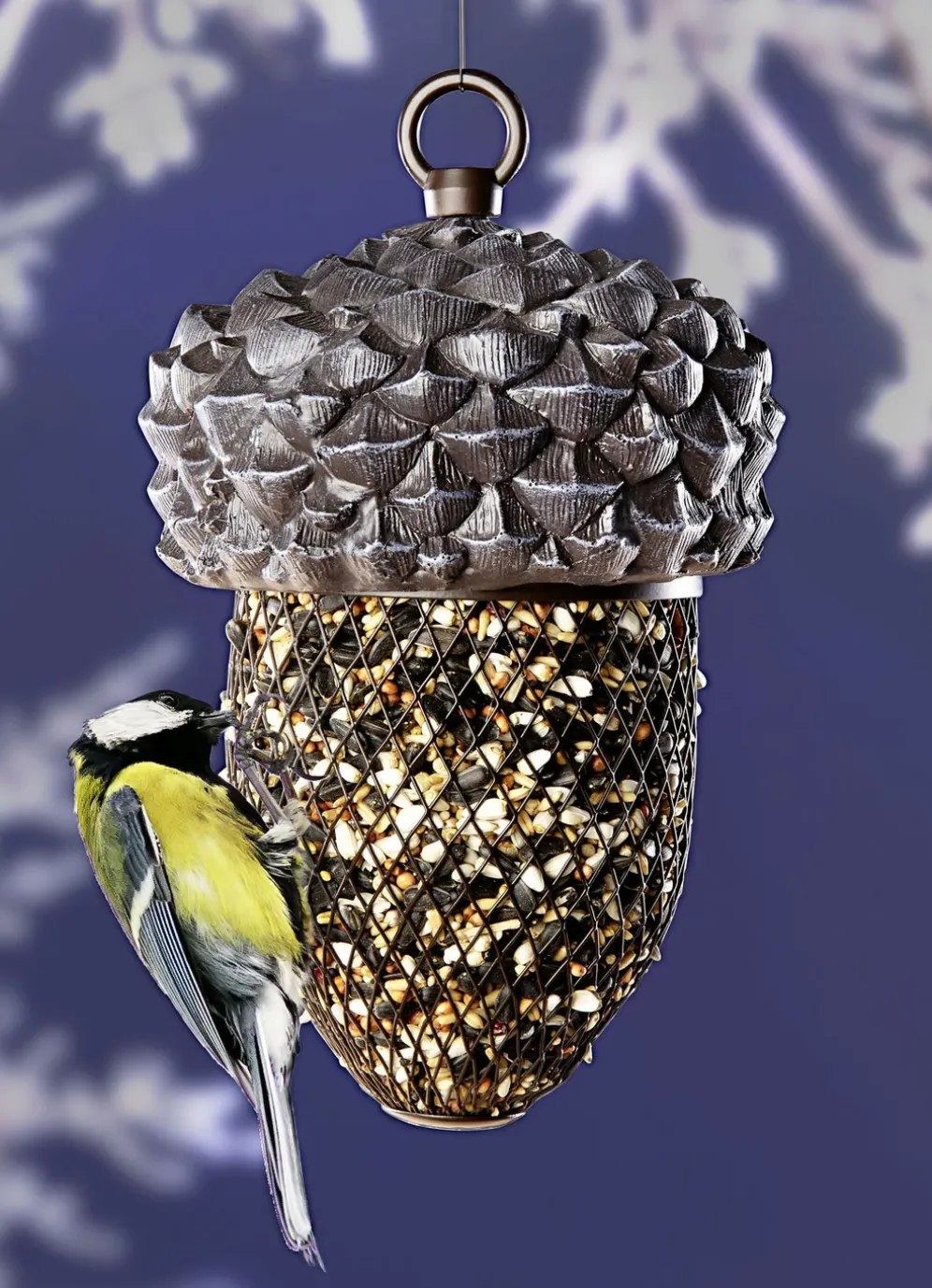 An dieser „Eichel“ aus Kunststoff werden die Vögel in der kalten Jahreszeit ihre Freude haben. Der Futterkorb aus Eisendraht bietet ihnen sicheren Halt. Einfach aufhängen und Futter (nicht im Lieferumfang enthalten) einfüllen. Maße: Höhe inkl. Aufhängung 23cm, Ø 13cm.