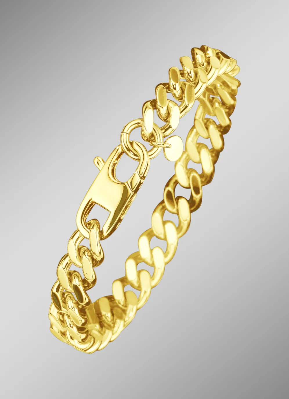 Zeitlos und mit maskulinem Touch zeigt sich dieses vollmassive Panzer-Armband aus Edelstahl, vergoldet. Die Armkette ist 9 mm stark und hat einen Karabinerverschluss.
