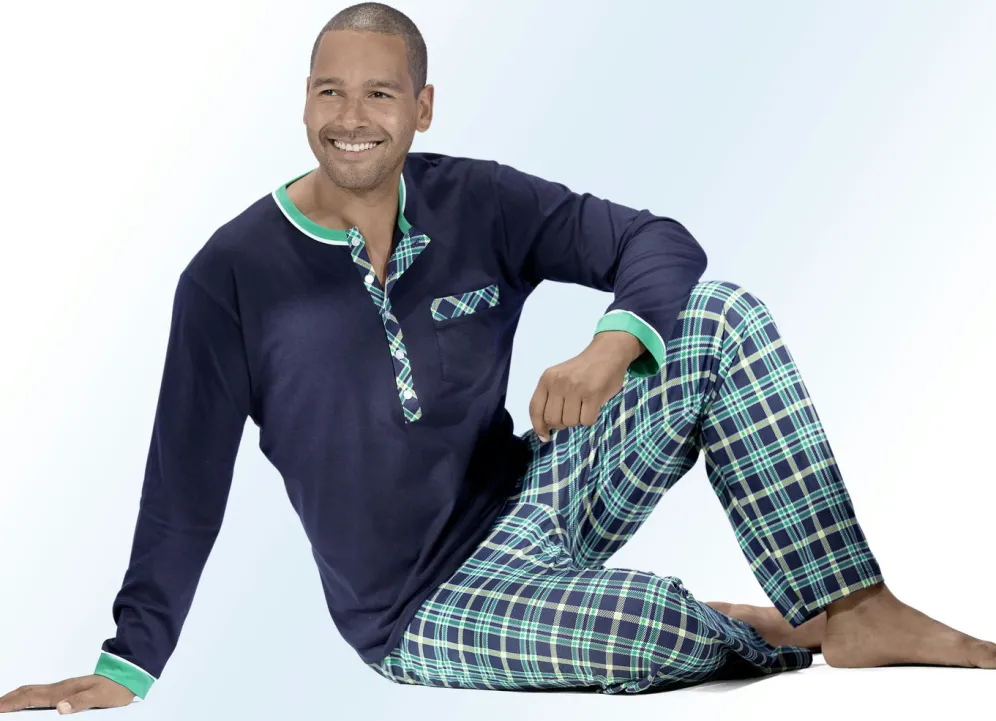 Schlafanzug und Shorty in Marine-Grün: Oberteile mit hübschen farbigen Details, längerer Knopfleiste sowie aufgesetzter Brusttasche. Die lange Hose mit offenen Beinabschlüssen und die Shorts zeigen ein tolles Karodessin und sind mit auswechselbarem Gummizug im Bund ausgestattet.