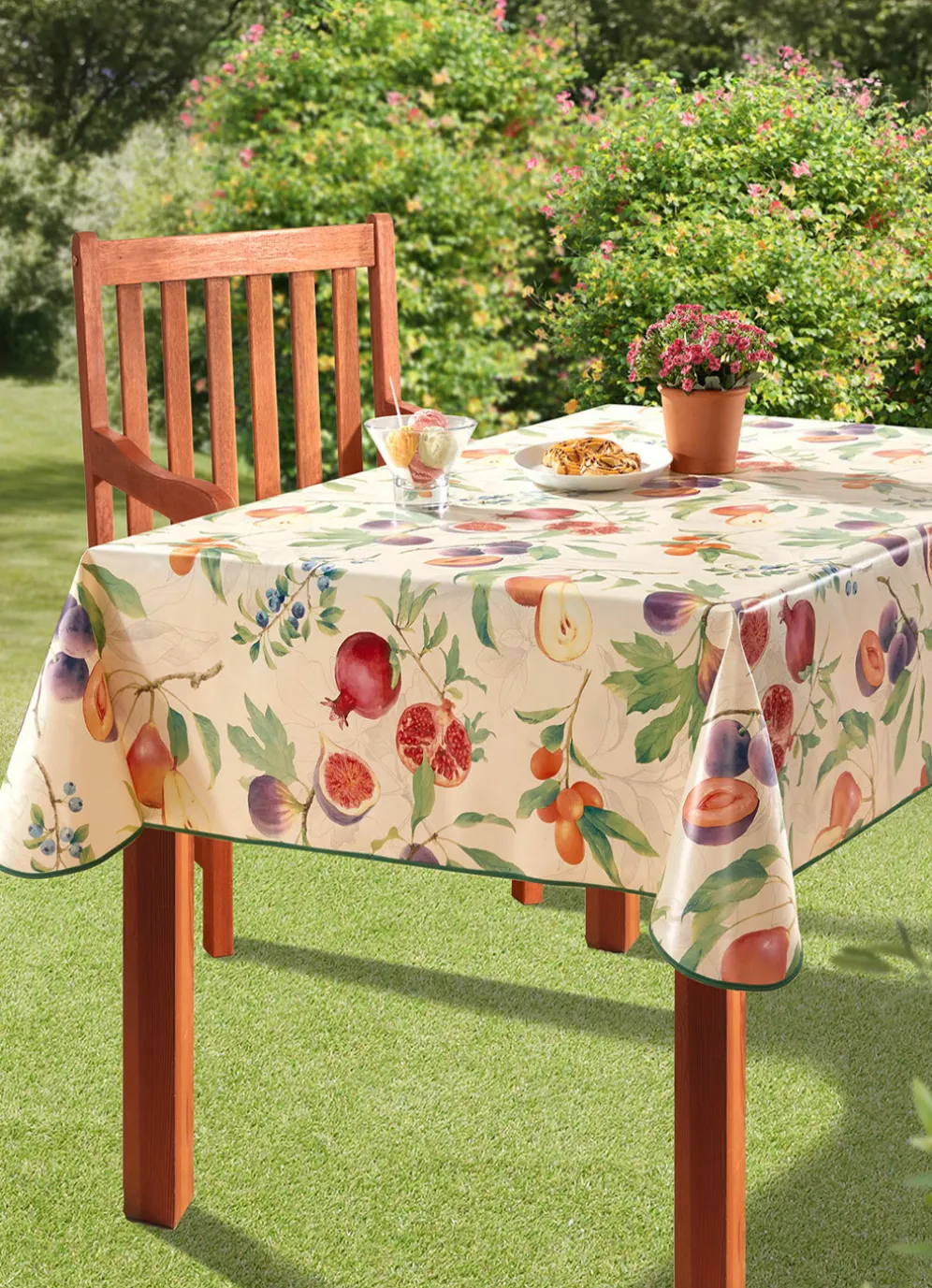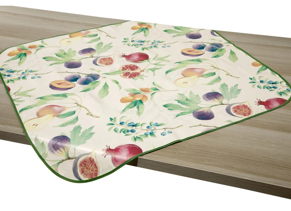 Hübsche, bunte Früchte schmücken diese Wachstuch-Tischdecke, die sich völlig problemlos abwaschen lässt und somit für jede Gelegenheit – auch für den Einsatz im Freien – geeignet ist. Mit farblich angepasstem Paspelband. Die Qualität: 100% Polyvinylchlorid, phthalatfrei