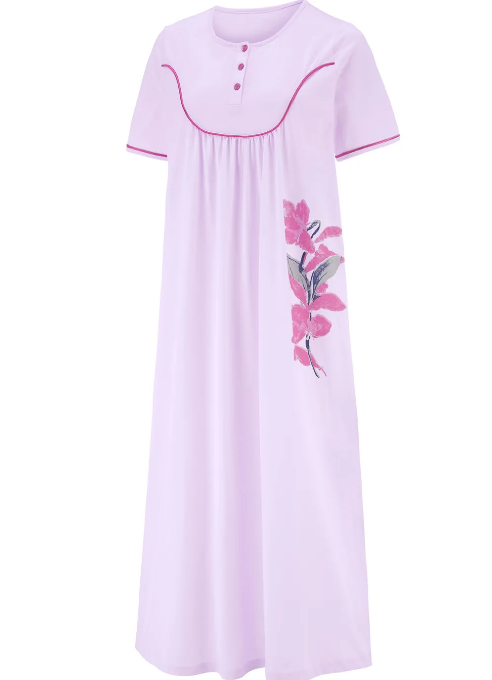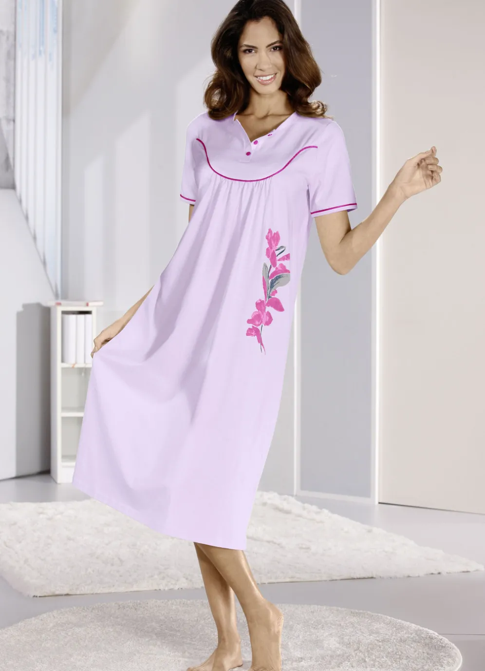 Wadenlanges Nachthemd mit Knopfleiste und kurzen Ärmeln in Flieder und in Größe 40.