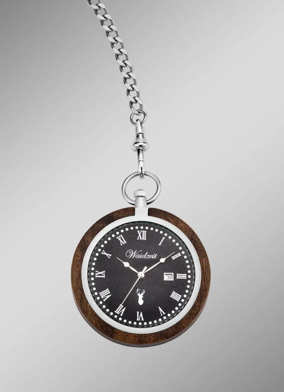 Die Waidzeit Taschenuhr aus Walnussholz trägt den Beinamen „antik“ deshalb, weil sie ein wunderschönes Ziffernblatt mit römischen Zahlen und auffälligen Zeigern hat. Sie ist mit ihrem schiefergrauen Ziffernblatt und der integrierten Datumsanzeige ein ganz spezieller Zeitmesser. Diese Holztaschenuhr liegt edel und angenehm in der Hand und ist definitiv ein besonderes Accessoire für festliche Anlässe und besondere Momente.