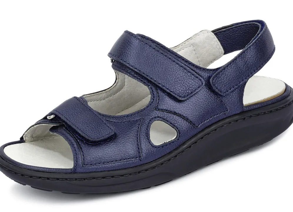 Waldläufer, bequeme Damen-Sandalen, Weite H, mit herausnehmbarem Fußbett in Stahlblau und in Schuhgröße 7 1/2.